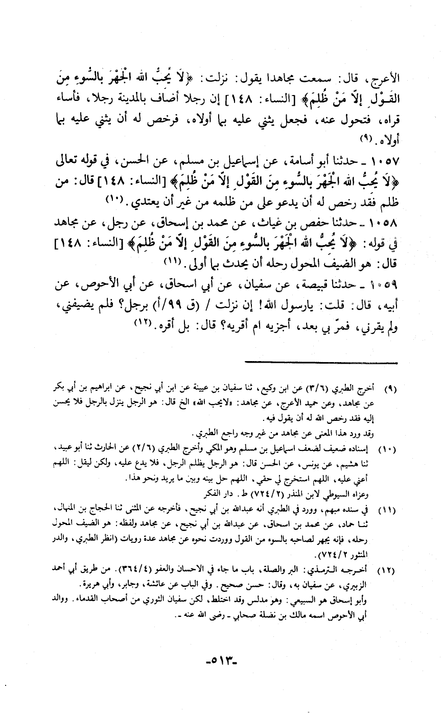 حَدَّثَنَا حَفْصُ بْنُ غِيَاثٍ، عَنْ مُحَمَّدِ بْنِ إِسْحَاقَ، عَنْ رَجُلٍ، عَنْ مُجَاهِدٍ فِي قَوْلِهِ: {§لَا يُحِبُّ اللَّهُ الْجَهْرَ بِالسُّوءِ مِنَ الْقَوْلِ إِلَّا مَنْ ظُلِمَ} [النساء: 148] قَالَ: «هُوَ الضَّيْفُ الْمُحَوِّلُ رَحْلَهُ أَنْ يُحَدِّثَ بِمَا أُولِيَ»