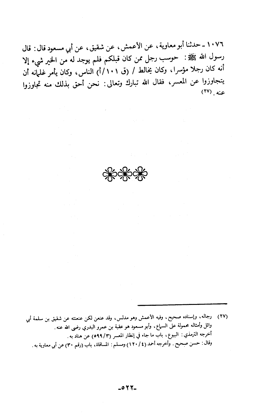 حَدَّثَنَا أَبُو مُعَاوِيَةَ، عَنِ الْأَعْمَشِ، عَنِ شَقِيقٍ، عَنْ أَبِي مَسْعُودٍ قَالَ: قَالَ رَسُولُ اللَّهِ صَلَّى اللهُ عَلَيْهِ وَسَلَّمَ: " حُوسِبَ رَجُلٌ مِمَّنْ كَانَ قَبْلَكُمْ فَلَمْ يُوجَدْ لَهُ مِنَ الْخَيْرِ شَيْءٌ إِلَّا أَنَّهُ كَانَ رَجُلًا مُوسِرًا وَكَانَ يُخَالِطُ النَّاسَ، وَكَانَ يَأْمُرُ غِلْمَانَهُ §أَنْ يَتَجَاوَزُوا عَنِ الْمُعْسِرِ، فَقَالَ اللَّهُ تَبَارَكَ وَتَعَالَى: نَحْنُ أَحَقُّ بِذَلِكَ مِنْهُ تَجَاوَزُوا عَنْهُ "