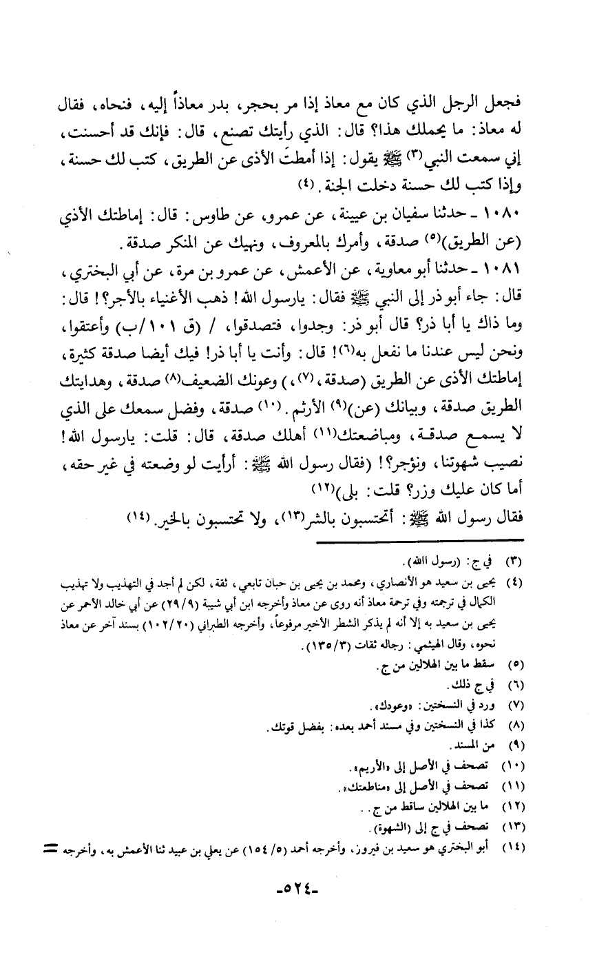 حَدَّثَنَا أَبُو مُعَاوِيَةَ، عَنِ الْأَعْمَشِ، عَنْ عَمْرِو بْنِ مُرَّةَ، عَنْ أَبِي الْبَخْتَرِيِّ قَالَ: جَاءَ أَبُو ذَرٍّ إِلَى النَّبِيِّ صَلَّى اللهُ عَلَيْهِ وَسَلَّمَ , فَقَالَ: يَا رَسُولَ اللَّهِ ذَهَبَ الْأَغْنِيَاءُ بِالْأَجْرِ قَالَ: «وَمَا ذَاكَ يَا أَبَا ذَرٍّ» ؟ قَالَ أَبُو ذَرٍّ: وَجَدُوا فَتَصَدَّقُوا وَأَعْتَقُوا، وَنَحْنُ لَيْسَ عِنْدَنَا مَا نَفْعَلُ بِهِ. قَالَ: وَأَنْتَ يَا أَبَا ذَرٍّ فِيكَ أَيْضًا صَدَقَةٌ كَثِيرَةٌ §إِمَاطَتُكَ الْأَذَى عَنِ الطَّرِيقِ صَدَقَةٌ، وَعَوْنُكَ الضَّعِيفَ صَدَقَةٌ، وَهِدَايَتُكَ الطَّرِيقَ صَدَقَةٌ، وَبَيَانُكَ عَنِ الْأَرْثَمِ صَدَقَةٌ , وَفَضْلُ سَمِعِكَ عَلَى الَّذِي لَا يَسْمَعُ صَدَقَةٌ , وَمُبَاضَعَتُكَ أَهْلَكَ صَدَقَةٌ " قَالَ: قُلْتُ: يَا رَسُولَ اللَّهِ نُصِيبُ شَهْوَتَنَا وَنُؤْجَرُ , فَقَالَ رَسُولُ اللَّهِ صَلَّى اللهُ عَلَيْهِ وَسَلَّمَ: «أَرَأَيْتَ لَوْ وَضَعْتَهُ فِي غَيْرِ حَقِّهِ أَمَا كَانَ عَلَيْكَ وِزْرٌ» ؟ قُلْتُ: بَلَى، فَقَالَ رَسُولُ اللَّهِ صَلَّى اللهُ عَلَيْهِ وَسَلَّمَ: «أَتَحْتَسِبُونَ بِالشَّرِّ وَلَا تَحْتَسِبُونَ بِالْخَيْرِ»