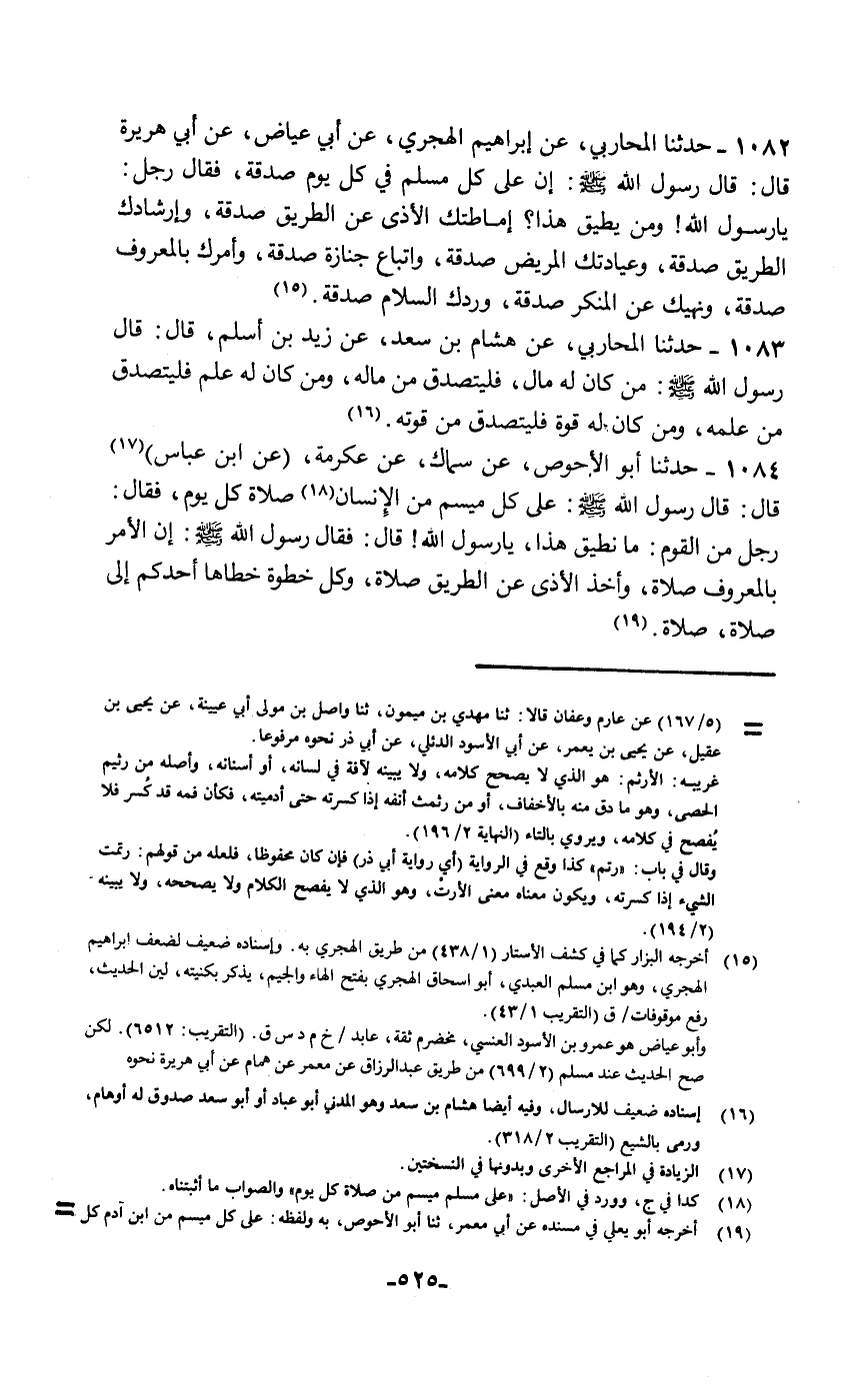 حَدَّثَنَا الْمُحَارِبِيُّ، عَنْ إِبْرَاهِيمَ الْهَجَرِيِّ، عَنْ أَبِي عِيَاضٍ، عَنْ أَبِي هُرَيْرَةَ قَالَ: قَالَ رَسُولُ اللَّهِ صَلَّى اللهُ عَلَيْهِ وَسَلَّمَ: «إِنَّ §عَلَى كُلِّ مُسْلِمٍ فِي كُلِّ يَوْمٍ صَدَقَةً» ، فَقَالَ رَجُلٌ: يَا رَسُولَ اللَّهِ , وَمَنْ يُطِيقُ هَذَا؟ إِمَاطَتُكَ الْأَذَى عَنِ الطَّرِيقِ صَدَقَةٌ , وَإِرْشَادُكَ الطَّرِيقَ صَدَقَةٌ , وَعِيَادَتُكَ الْمَرِيضَ صَدَقَةٌ , وَاتِّبَاعُ جِنَازَةٍ صَدَقَةٌ , وَأَمْرُكَ بِالْمَعْرُوفِ صَدَقَةٌ , وَنَهْيُكَ عَنِ الْمُنْكَرِ صَدَقَةٌ , وَرَدُّكَ السَّلَامَ صَدَقَةٌ "