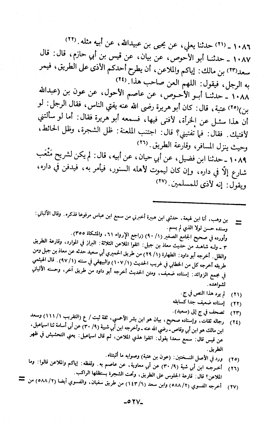 حَدَّثَنَا أَبُو الْأَحْوَصِ، عَنْ بَيَانٍ، عَنْ قَيْسِ بْنِ أَبِي حَازِمٍ قَالَ: قَالَ سَعْدُ بْنُ مَالِكٍ: " §إِيَّاكُمْ وَالْمَلَاعِنَ، أَنْ يَطْرَحَ، أَحَدُكُمُ الْأَذَى عَلَى الطَّرِيقِ , فَيَمُرُّ بِهِ الرَّجُلُ , فَيَقُولُ: اللَّهُمَّ , الْعَنْ صَاحِبَ هَذَا "
