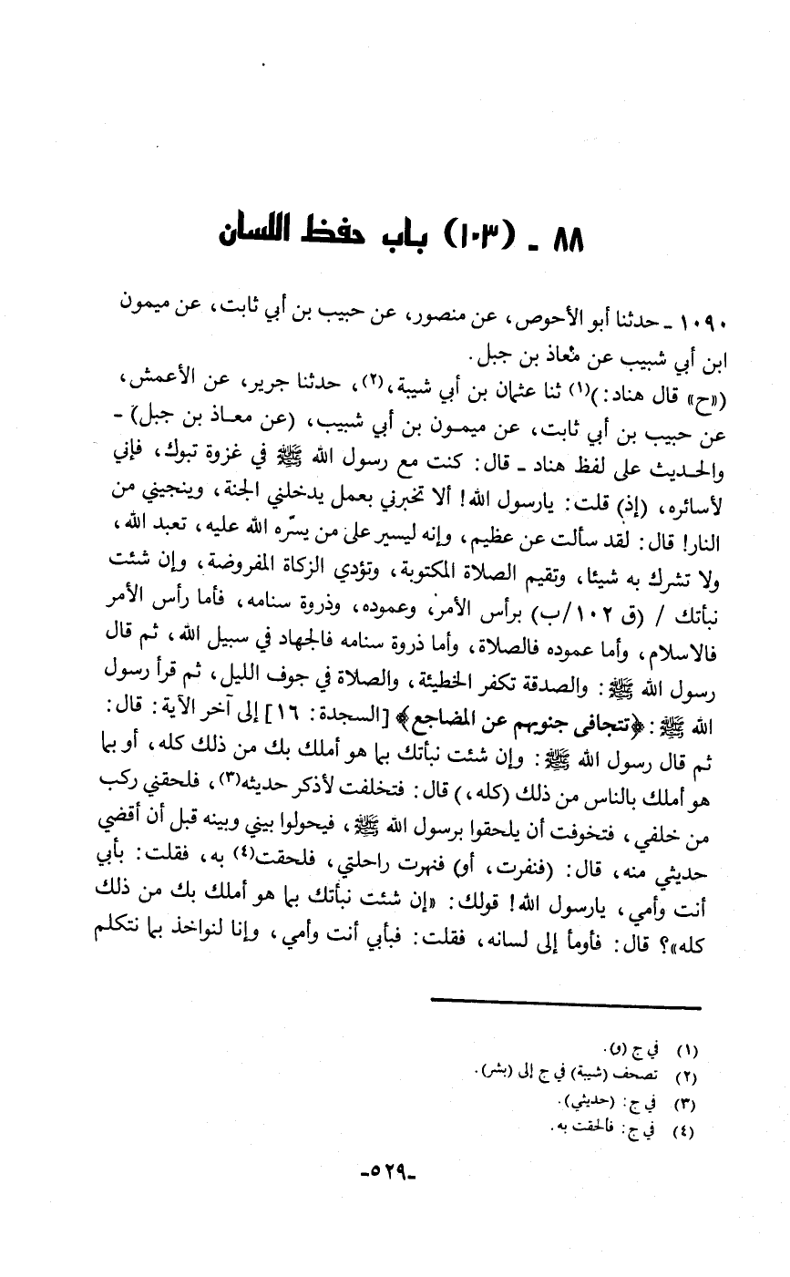 حَدَّثَنَا أَبُو الْأَحْوَصِ، عَنْ مَنْصُورٍ، عَنْ حَبِيبِ بْنِ أَبِي ثَابِتٍ، عَنْ مَيْمُونِ بْنِ أَبِي شَبِيبٍ، عَنْ مُعَاذِ بْنِ جَبَلٍ، ح قَالَ: هَنَّادٌ ثنا عُثْمَانُ بْنُ أَبِي شَيْبَةَ، حَدَّثَنَا جَرِيرٌ، عَنِ الْأَعْمَشِ، عَنْ حَبِيبِ بْنِ أَبِي ثَابِتٍ، عَنْ مَيْمُونِ بْنِ أَبِي شَبِيبٍ، عَنْ مُعَاذِ بْنِ جَبَلٍ، وَالْحَدِيثُ عَلَى لَفْظِ هَنَّادٍ، قَالَ: كُنْتُ مَعَ رَسُولِ اللَّهِ صَلَّى اللهُ عَلَيْهِ وَسَلَّمَ فِي غَزْوَةِ تَبُوكَ فَإِنِّي لَأُسَايِرُهُ إِذْ قُلْتُ: يَا رَسُولَ اللَّهِ , أَلَا تُخْبِرُنِي بِعَمَلٍ يُدْخِلُنِي الْجَنَّةَ , وَيُنْجِينِي مِنَ النَّارِ؟ قَالَ: «لَقَدْ سَأَلْتَ عَنْ عَظِيمِ وَإِنَّهُ لَيَسِيرٌ عَلَى مَنْ يَسُرُّهُ اللَّهُ عَلَيْهِ، تَعْبُدُ اللَّهَ , وَلَا تُشْرِكُ بِهِ شَيْئًا , وَتُقِيمُ الصَّلَاةَ الْمَكْتُوبَةَ , وَتُؤَدِّي الزَّكَاةَ الْمَفْرُوضَةَ، وَإِنْ شِئْتَ نَبَّأْتُكَ بِرَأْسِ الْأَمْرِ وَعَمُودِهِ وَذُرْوَةِ سَنَامِهِ، فَأَمَّا رَأْسُ الْأَمْرِ فَالْإِسْلَامُ، وَأَمَّا عَمُودُهُ فَالصَّلَاةُ، وَأَمَّا ذِرْوَةُ سَنَامِهِ فَالْجِهَادُ فِي سَبِيلِ اللَّهِ» ، ثُمَّ قَالَ رَسُولُ اللَّهِ صَلَّى اللهُ عَلَيْهِ وَسَلَّمَ: " وَالصَّدَقَةُ تُكَفِّرُ الْخَطِيئَةَ، وَالصَّلَاةُ فِي جَوْفِ اللَّيْلِ , ثُمَّ قَرَأَ رَسُولُ اللَّهِ صَلَّى اللهُ عَلَيْهِ وَسَلَّمَ: {تَتَجَافَى جُنُوبُهُمْ عَنِ الْمَضَاجِعِ} [السجدة: 16] إِلَى آخِرِ الْآيَةِ. قَالَ: ثُمَّ قَالَ رَسُولُ اللَّهِ صَلَّى اللهُ عَلَيْهِ وَسَلَّمَ: «وَإِنْ شِئْتَ نَبَّأْتُكَ بِمَا هُوَ أَمْلَكُ بِكَ مِنْ ذَلِكَ كُلِّهِ أَوْ بِمَا هُوَ أَمْلَكُ بِالنَّاسِ مِنْ ذَلِكَ كُلِّهِ» قَالَ: فَتَخَلَّفْتُ لِأَذْكُرَ حَدِيثَهُ , فَلَحِقَنِي رَكْبٌ مِنْ خَلْفِي فَتَخَوَّفْتُ أَنْ يَلْحَقُوا بِرَسُولِ اللَّهِ صَلَّى اللهُ عَلَيْهِ وَسَلَّمَ فَيَحُولُوا بَيْنِي وَبَيْنَهُ قَبْلَ أَنْ أَقْضِيَ حَدِيثِي مِنْهُ. قَالَ: فَنَفَرْتُ أَوْ فَنَهَرْتُ رَاحِلَتِي فَلَحِقْتُ بِهِ , فَقُلْتُ: بِأَبِي أَنْتَ وَأُمِّي يَا رَسُولَ اللَّهِ , قَوْلُكَ إِنْ شِئْتَ نَبَّأْتُكَ بِمَا هُوَ أَمْلَكُ بِكَ مِنْ ذَلِكَ كُلِّهِ، فَأَوْمَأَ إِلَى لِسَانِهِ؛ , فَقُلْتُ: بِأَبِي أَنْتَ وَأُمِّي؛ وَإِنَّا لَنُؤَاخَذُ بِمَا نَتَكَلَّمُ