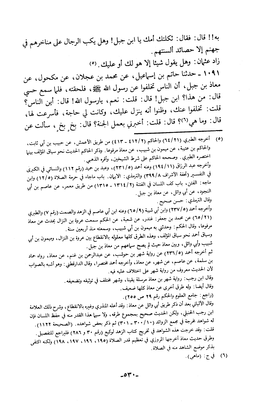 بِهِ؟ قَالَ: فَقَالَ: «ثَكِلَتْكَ أُمُّكَ يَا ابْنَ جَبَلٍ، وَهَلْ يَكُبُّ الرِّجَالَ عَلَى مَنَاخِرِهِمْ فِي جَهَنَّمَ §إِلَّا حَصَائِدُ أَلْسِنَتِهِمْ» زَادَ عُثْمَانُ: وَهَلْ يَقُولُ شَيْئًا إِلَّا هُوَ لَكَ أَوْ عَلَيْكَ