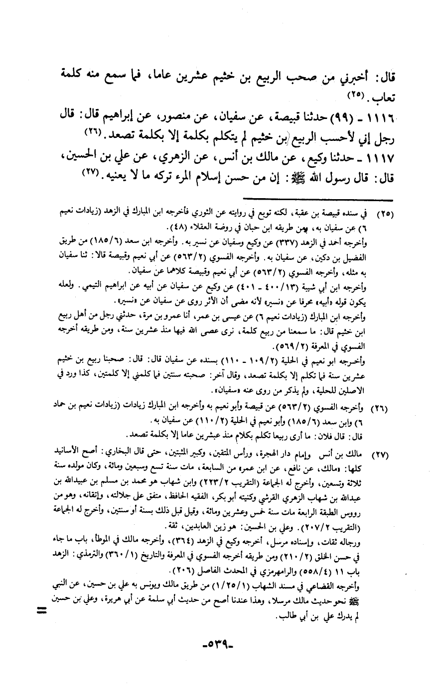 حَدَّثَنَا وَكِيعٌ، عَنْ مَالِكِ بْنِ أَنَسٍ، عَنِ الزُّهْرِيِّ، عَنْ عَلِيِّ بْنِ الْحُسَيْنِ قَالَ: قَالَ رَسُولُ اللَّهِ صَلَّى اللهُ عَلَيْهِ وَسَلَّمَ: «إِنَّ §مِنْ حُسْنِ إِسْلَامِ الْمَرْءِ تَرْكَهُ مَا لَا يَعْنِيهِ»