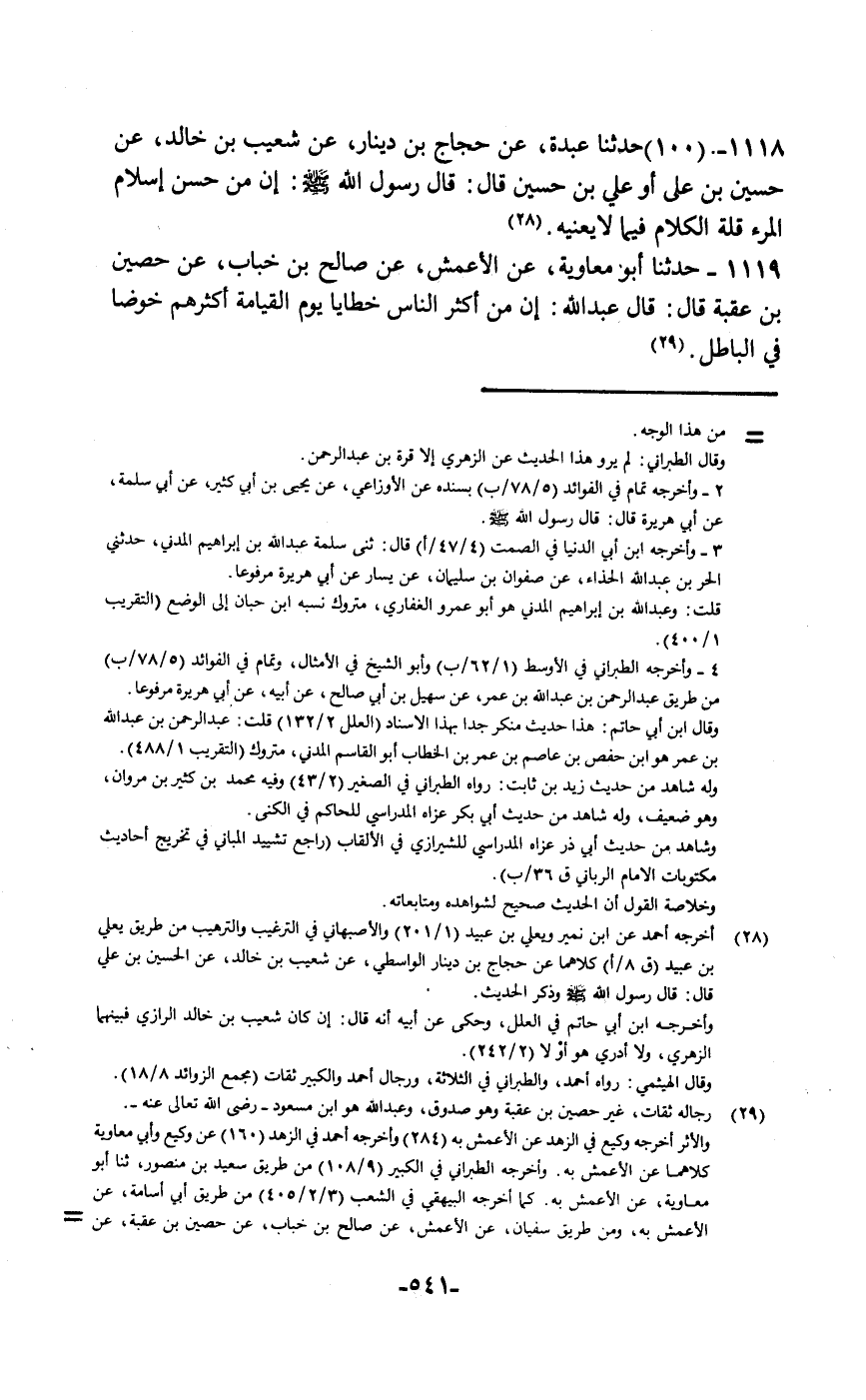 حَدَّثَنَا عَبْدَةُ، عَنْ حَجَّاجِ بْنِ دِينَارٍ، عَنْ شُعَيْبِ بْنِ خَالِدٍ، عَنْ حُسَيْنِ بْنِ عَلِيٍّ، أَوْ عَلِيِّ بْنِ حُسَيْنٍ قَالَ: قَالَ رَسُولُ اللَّهِ صَلَّى اللهُ عَلَيْهِ وَسَلَّمَ: «إِنَّ §مِنْ حُسْنِ إِسْلَامِ الْمَرْءِ قِلَّةَ الْكَلَامِ فِيمَا لَا يَعْنِيهِ»
