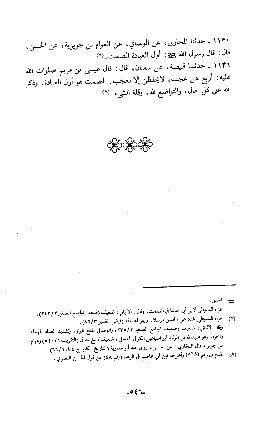 حَدَّثَنَا الْمُحَارِبِيُّ، عَنِ الْوَصَّافِيِّ، عَنِ الْعَوَّامِ بْنِ جُوَيْرِيَةَ، عَنِ الْحَسَنِ قَالَ: قَالَ رَسُولُ اللَّهِ صَلَّى اللهُ عَلَيْهِ وَسَلَّمَ: «§أَوَّلُ الْعِبَادَةِ الصَّمْتُ»