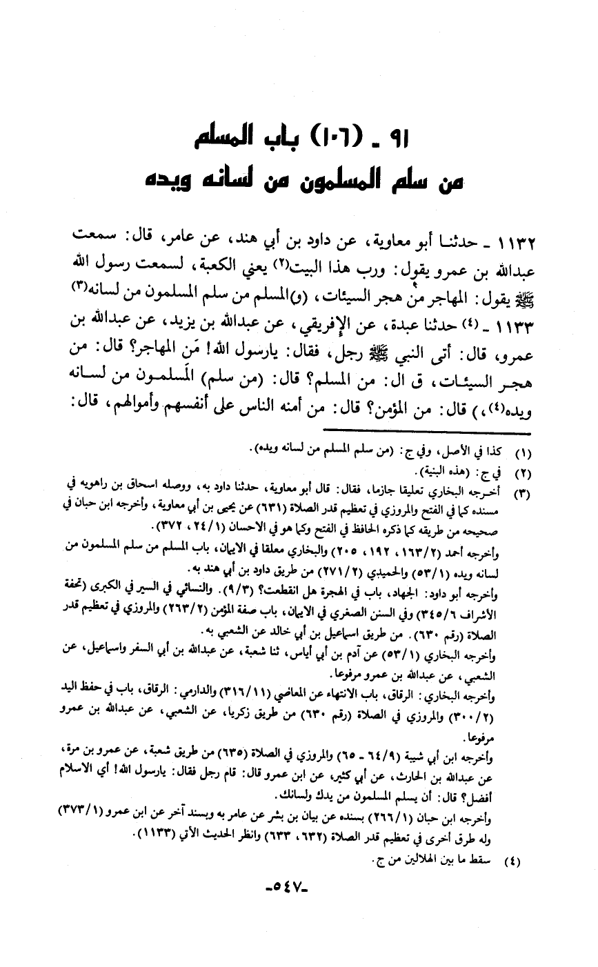 حَدَّثَنَا أَبُو مُعَاوِيَةَ، عَنْ دَاوُدَ بْنِ أَبِي هِنْدَ، عَنْ عَامِرٍ قَالَ: سَمِعْتُ عَبْدَ اللَّهِ بْنَ عَمْرٍو يَقُولُ: وَرَبِّ هَذَا الْبَيْتِ , يَعْنِي الْكَعْبَةَ لَسَمِعْتُ رَسُولَ اللَّهِ صَلَّى اللهُ عَلَيْهِ وَسَلَّمَ يَقُولُ: «§الْمُهَاجِرُ مَنْ هَجَرَ السَّيِّئَاتِ، وَالْمُسْلِمُ مَنْ سَلِمَ الْمُسْلِمُونَ مِنْ لِسَانِهِ»