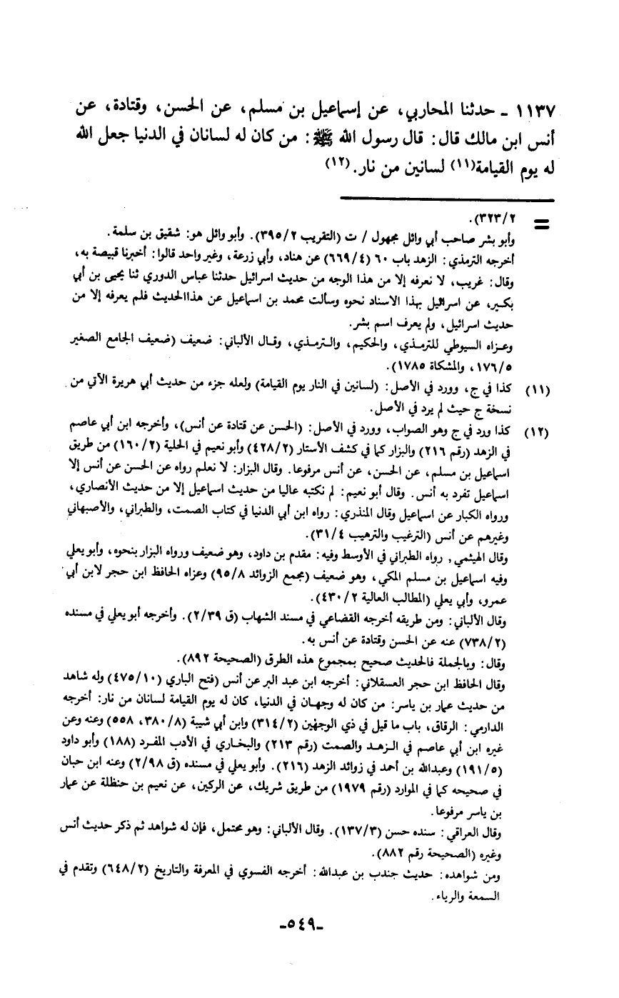 حَدَّثَنَا الْمُحَارِبِيُّ، عَنْ إِسْمَاعِيلَ بْنِ مُسْلِمٍ، عَنِ الْحَسَنِ، وَقَتَادَةَ، عَنْ أَنَسِ بْنِ مَالِكٍ قَالَ: قَالَ رَسُولُ اللَّهِ صَلَّى اللهُ عَلَيْهِ وَسَلَّمَ: «§مَنْ كَانَ لَهُ لِسَانَانِ فِي الدُّنْيَا جَعَلَ اللَّهُ لَهُ يَوْمَ الْقِيَامَةِ لِسَانَيْنِ مِنْ نَارٍ»