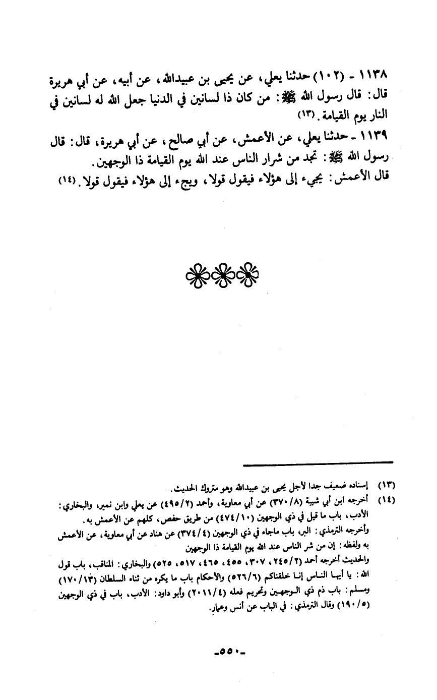 حَدَّثَنَا يَعْلَى، عَنْ يَحْيَى بْنِ عُبَيْدِ اللَّهِ، عَنْ أَبِيهِ، عَنْ أَبِي هُرَيْرَةَ قَالَ: قَالَ رَسُولُ اللَّهِ صَلَّى اللهُ عَلَيْهِ وَسَلَّمَ: «§مَنْ كَانَ ذَا لِسَانَيْنِ فِي الدُّنْيَا جَعَلَ اللَّهُ لَهُ لِسَانَيْنِ فِي النَّارِ يَوْمَ الْقِيَامَةِ»