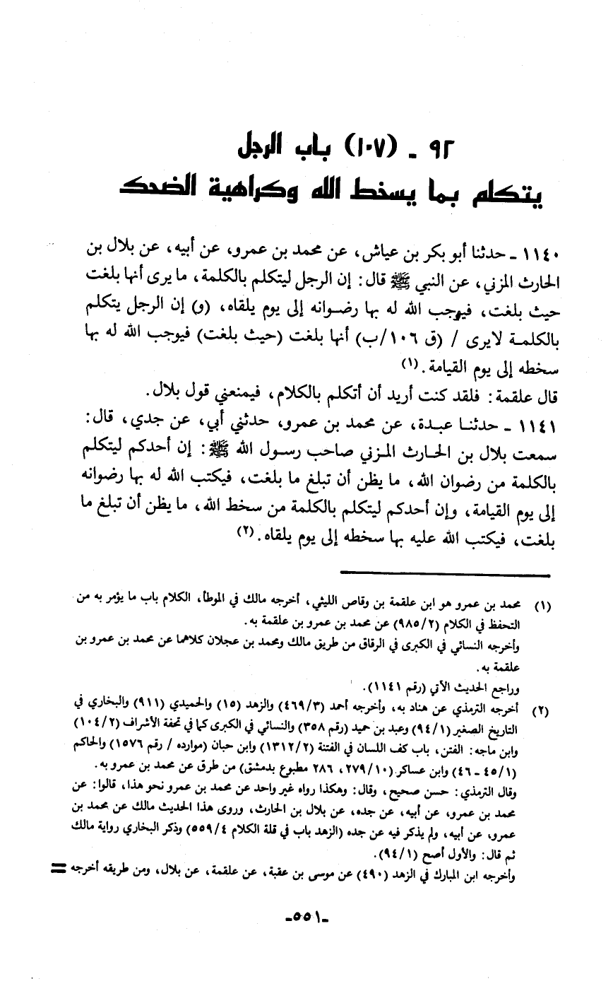 حَدَّثَنَا أَبُو بَكْرِ بْنُ عَيَّاشٍ، عَنْ مُحَمَّدِ بْنِ عَمْرٍو، عَنْ أَبِيهِ، عَنْ بِلَالِ بْنِ الْحَارِثِ الْمُزَنِيِّ، عَنِ النَّبِيِّ صَلَّى اللهُ عَلَيْهِ وَسَلَّمَ قَالَ: «إِنَّ §الرَّجُلَ لَيَتَكَلَّمُ بِالْكَلِمَةِ مَا يَرَى أَنَّهَا بَلَغَتْ حَيْثُ بَلَغَتْ فَيُوجِبُ اللَّهُ لَهُ بِهَا رِضْوَانَهُ إِلَى يَوْمِ يَلْقَاهُ، وَإِنَّ الرَّجُلَ يَتَكَلَّمُ بِالْكَلِمَةِ لَا يَرَى أَنَّهَا بَلَغَتْ حَيْثُ بَلَغَتْ فَيُوجِبُ اللَّهُ لَهُ بِهَا سَخَطَهُ إِلَى يَوْمِ الْقِيَامَةِ» . قَالَ عَلْقَمَةُ: فَلَقَدْ كُنْتُ أُرِيدُ أَنْ أَتَكَلَّمَ بِالْكَلَامِ فَيَمْنَعُنِي قَوْلُ بِلَالٍ