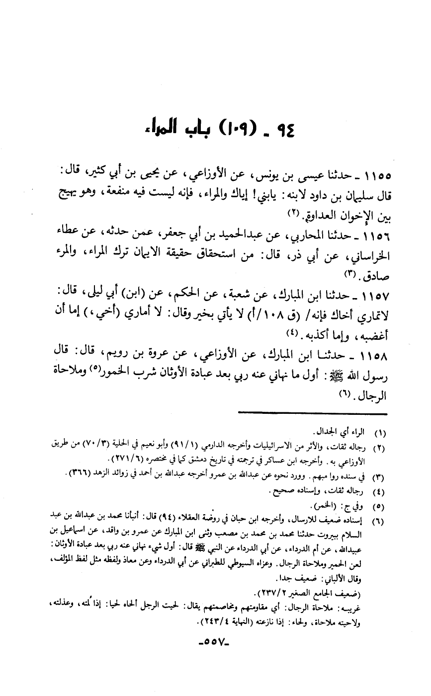 حَدَّثَنَا عِيسَى بْنُ يُونُسَ، عَنِ الْأَوْزَاعِيِّ، عَنْ يَحْيَى بْنِ أَبِي كَثِيرٍ قَالَ: قَالَ سُلَيْمَانُ بْنُ دَاوُدَ لِابْنِهِ: «يَا بُنَيَّ , §إِيَّاكَ وَالْمِرَاءَ؛ فَإِنَّهُ لَيْسَتْ فِيهِ مَنْفَعَةٌ وَهُوَ يُهَيِّجُ بَيْنَ الْإِخْوَانِ الْعَدَاوَةَ»