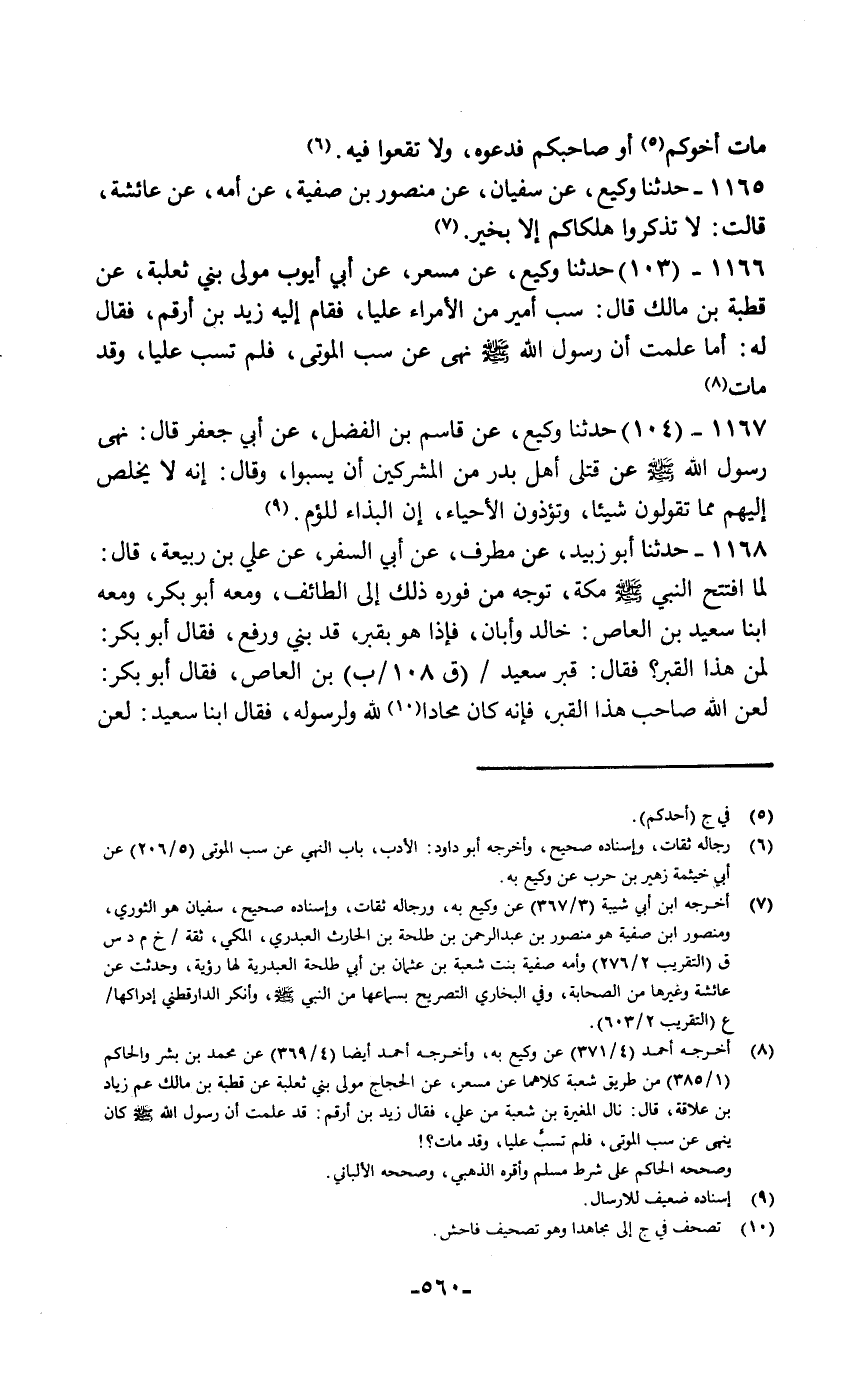 حَدَّثَنَا وَكِيعٌ، عَنْ مِسْعَرٍ، عَنْ أَبِي أَيُّوبَ مَوْلَى بَنِي ثَعْلَبَةَ عَنْ، قُطْبَةَ بْنِ مَالِكٍ قَالَ: سَبَّ أَمِيرٌ مِنَ الْأُمَرَاءِ عَلِيًّا فَقَامَ إِلَيْهِ زَيْدُ بْنُ أَرْقَمَ فَقَالَ لَهُ: «أَمَا عَلِمْتَ أَنَّ رَسُولَ اللَّهِ صَلَّى اللهُ عَلَيْهِ وَسَلَّمَ §نَهَى عَنْ سَبِّ الْمَوْتَى، فَلِمَ تَسُبُّ عَلِيًّا وَقَدْ مَاتَ؟»