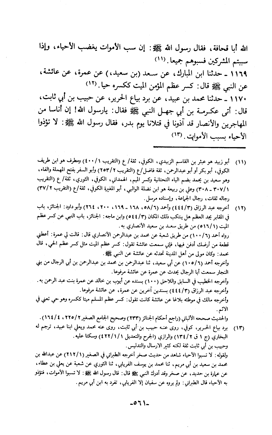 حَدَّثَنَا ابْنُ الْمُبَارَكِ، عَنْ سَعْدِ بْنِ سَعِيدٍ، عَنْ عَمْرَةَ، عَنْ عَائِشَةَ، عَنِ النَّبِيِّ صَلَّى اللهُ عَلَيْهِ وَسَلَّمَ قَالَ: «§كَسْرُ عَظْمِ الْمُؤْمِنِ الْمَيِّتِ كَكَسْرِهِ حَيًّا»