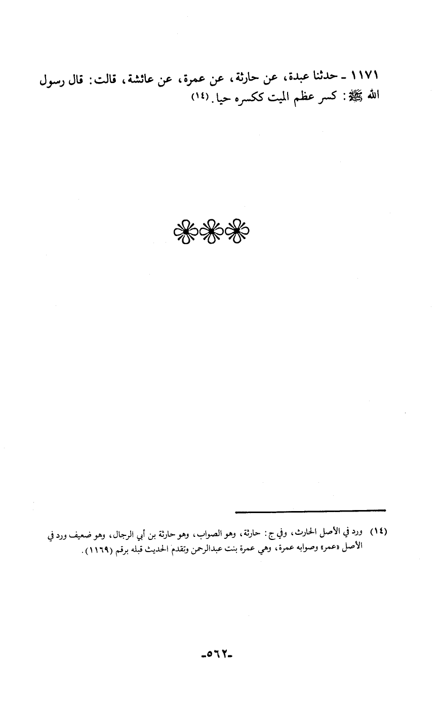 حَدَّثَنَا عَبْدَةُ، عَنْ حَارِثَةَ، عَنْ عَمْرَةَ، عَنْ عَائِشَةَ قَالَتْ: قَالَ رَسُولُ اللَّهِ صَلَّى اللهُ عَلَيْهِ وَسَلَّمَ: «§كَسْرُ عَظْمِ الْمَيِّتِ كَكَسْرِهِ حَيًّا»