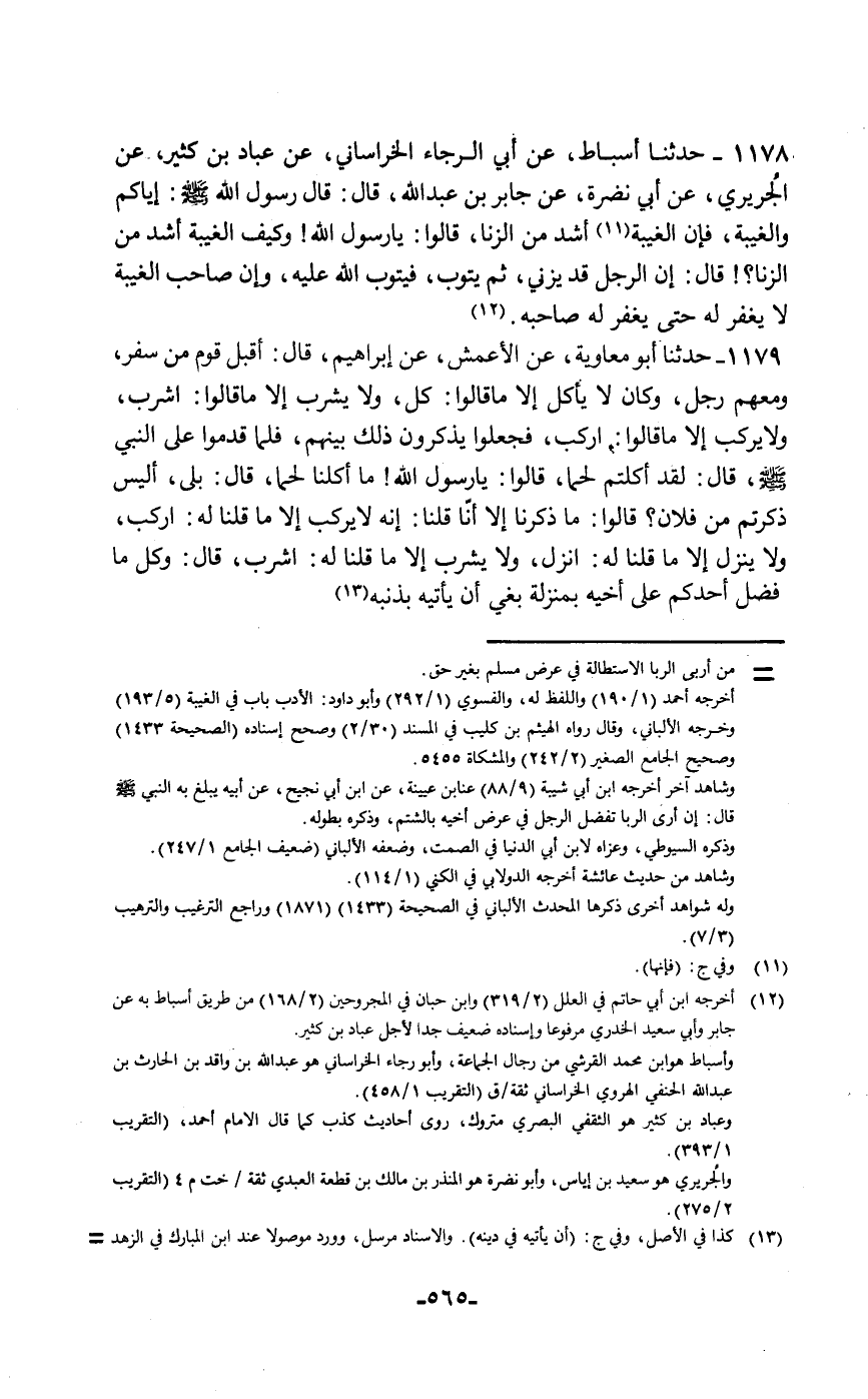 حَدَّثَنَا أَسْبَاطٌ، عَنْ أَبِي الرَّجَاءِ الْخُرَاسَانِيِّ، عَنْ عَبَّادِ بْنِ كَثِيرٍ، عَنِ الْجُرَيْرِيِّ، عَنْ أَبِي نَضْرَةَ، عَنْ جَابِرِ بْنِ عَبْدِ اللَّهِ قَالَ: قَالَ رَسُولُ اللَّهِ صَلَّى اللهُ عَلَيْهِ وَسَلَّمَ: «§إِيَّاكُمْ وَالْغِيبَةَ فَإِنَّ الْغِيبَةَ أَشَدُّ مِنَ الزِّنَا» ، قَالُوا: يَا رَسُولَ اللَّهِ , وَكَيْفَ الْغِيبَةُ أَشَدُّ مِنَ الزِّنَا؟ قَالَ: «إِنَّ الرَّجُلَ قَدْ يَزْنِي , ثُمَّ يَتُوبُ فَيَتُوبُ اللَّهُ عَلَيْهِ، وَإِنَّ صَاحِبَ الْغِيبَةِ لَا يُغْفَرُ لَهُ حَتَّى يَغْفِرَ لَهُ صَاحِبُهُ»