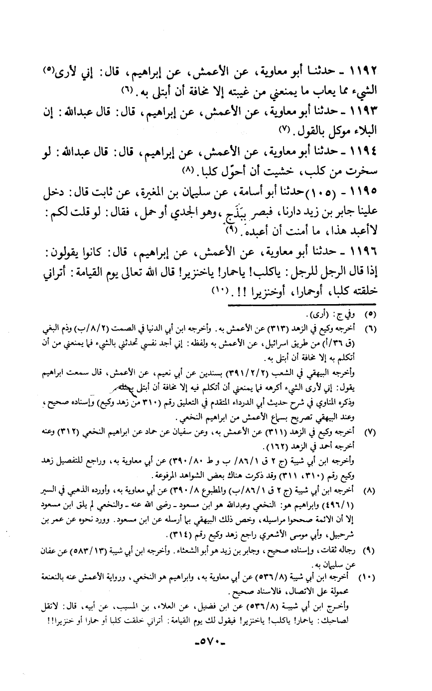 حَدَّثَنَا أَبُو مُعَاوِيَةَ، عَنِ الْأَعْمَشِ، عَنْ إِبْرَاهِيمَ قَالَ: «إِنِّي لَأَرَى الشَّيْءَ مِمَّا يُعَابُ §مَا يَمْنَعُنِي مِنْ غِيبَتِهِ إِلَّا مَخَافَةُ أَنَّ أُبْتَلَى بِهِ»