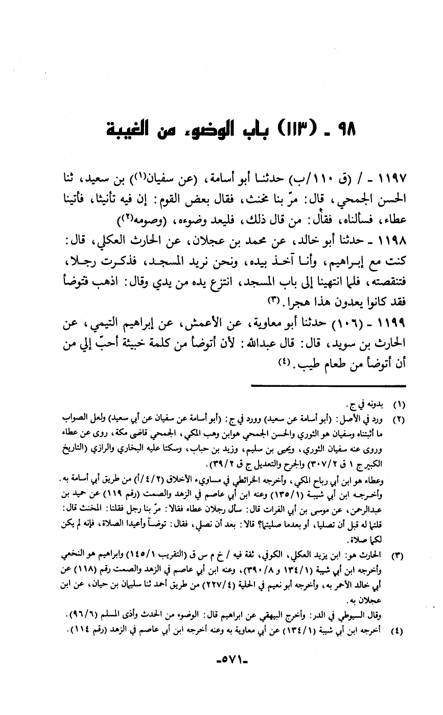 حَدَّثَنَا أَبُو مُعَاوِيَةَ، عَنِ الْأَعْمَشِ، عَنْ إِبْرَاهِيمَ التَّيْمِيِّ، عَنِ الْحَارِثِ بْنِ سُوَيْدٍ قَالَ: قَالَ عَبْدُ اللَّهِ: «§لَأَنْ أَتَوَضَّأَ مِنْ كَلِمَةٍ خَبِيثَةٍ أَحَبُّ إِلَيَّ مِنْ أَنْ أَتَوَضَّأَ مِنْ طَعَامٍ طَيِّبٍ»