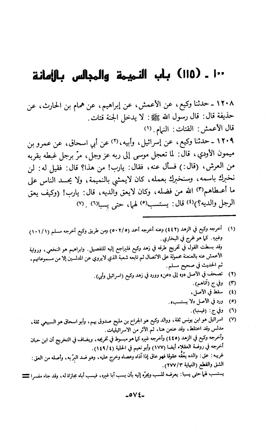 حَدَّثَنَا وَكِيعٌ، عَنِ الْأَعْمَشِ، عَنْ إِبْرَاهِيمَ، عَنْ هَمَّامِ بْنِ الْحَارِثِ، عَنْ حُذَيْفَةَ قَالَ: قَالَ رَسُولُ اللَّهِ صَلَّى اللهُ عَلَيْهِ وَسَلَّمَ: «§لَا يَدْخُلُ الْجَنَّةَ قَتَّاتٌ» قَالَ الْأَعْمَشُ: الْقَتَّاتُ: النَّمَّامُ
