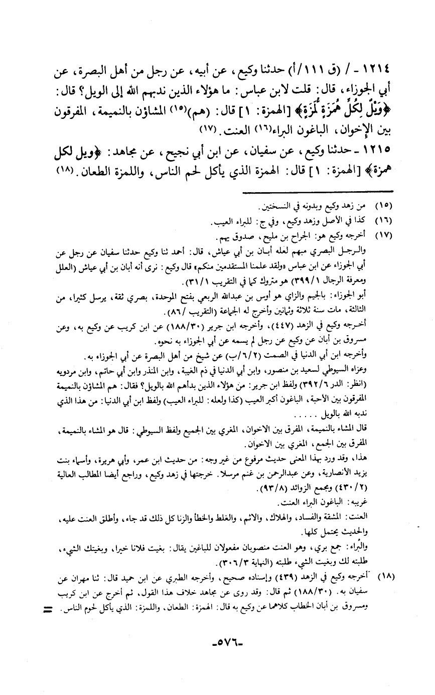 حَدَّثَنَا وَكِيعٌ، عَنْ أَبِيهِ، عَنْ رَجُلٍ مِنْ أَهْلِ الْبَصْرَةِ، عَنْ أَبِي الْجَوْزَاءِ قَالَ: قُلْتُ لِابْنِ عَبَّاسٍ: مَا هَؤُلَاءِ الَّذِينَ نَدَبَهُمُ اللَّهُ إِلَى الْوَيْلِ؟ قَالَ: {§وَيْلٌ لِكُلِّ هُمَزَةٍ لُمَزَةٍ} [الهمزة: 1] . قَالَ: " هُمُ الْمَشَّاءُونَ بِالنَّمِيمَةِ، الْمُفَرِّقُونَ بَيْنَ الْإِخْوَانِ، الْبَاغُونَ لِلْبُرَآءِ الْعَنَتَ