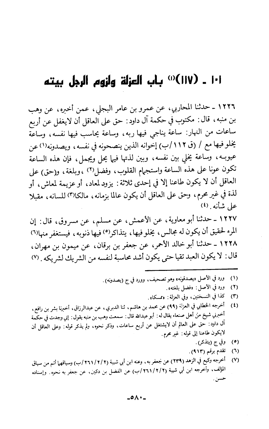حَدَّثَنَا الْمُحَارِبِيُّ، عَنْ عَمْرِو بْنِ عَامِرٍ الْبَجَلِيِّ، عَمَّنْ أَخْبَرَهُ، عَنْ وَهْبِ بْنِ مُنَبِّهٍ قَالَ: مَكْتُوبٌ فِي حِكْمَةِ آلِ دَاوُدَ: " حَقٌّ عَلَى الْعَاقِلِ أَنْ لَا يَغْفَلَ عَنْ أَرْبَعِ سَاعَاتٍ مِنَ النَّهَارِ: سَاعَةٌ يُنَاجِي فِيهَا رَبَّهُ، وَسَاعَةٌ يُحَاسِبُ فِيهَا نَفْسَهُ، §وَسَاعَةٌ يَخْلُو فِيهَا مَعَ إِخْوَانِهِ الَّذِينَ يَنْصَحُونَهُ فِي نَفْسِهِ وَيَصُدُّونَهُ عَنْ عُيُوبِهِ، وَسَاعَةٌ يُخَلِّي بَيْنَ نَفْسِهِ وَبَيْنَ لَذَّتِهَا فِيمَا يَحِلُّ وَيَجْمُلُ؛ فَإِنَّ هَذِهِ السَّاعَةَ تَكُونُ عَوْنًا عَلَى هَذِهِ السَّاعَةِ وَاسْتِجْمَامِ الْقُلُوبِ , وَفَضْلٍ , وَبُلْغَةٍ، وَحَقٌّ عَلَى الْعَاقِلِ أَنْ لَا يَكُونَ طَاعِنًا إِلَّا فِي إِحْدَى ثَلَاثَةٍ يُزَوِّدُ لِمَعَادٍ أَوْ عَزِيمَةٍ لِمَعَاشٍ أَوْ لَذَّةٍ فِي غَيْرِ مُحَرَّمٍ. وَحَقٌّ عَلَى الْعَاقِلِ أَنْ يَكُونَ عَالِمًا بِزَمَانِهِ مَالِكًا لِلِسَانِهِ، مُقْبِلًا عَلَى شَأْنِهِ "