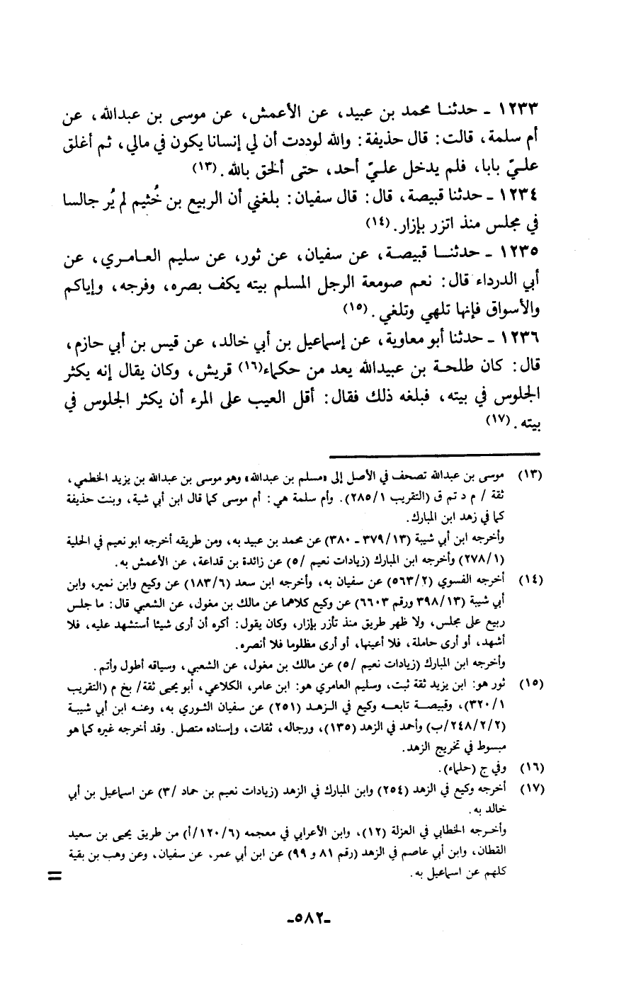 حَدَّثَنَا قَبِيصَةُ قَالَ: قَالَ سُفْيَانُ: «بَلَغَنِي أَنَّ الرَّبِيعَ بْنَ خُثَيْمٍ §لَمْ يُرَ جَالِسًا فِي مَجْلِسٍ مُنْذُ اتَّزَرَ بِإِزَارٍ»