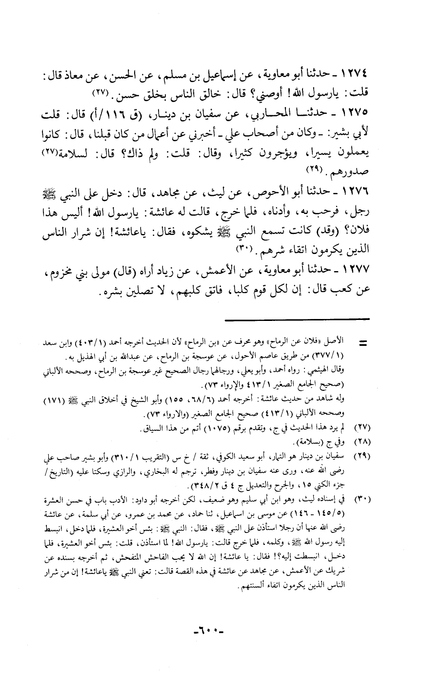 حَدَّثَنَا أَبُو الْأَحْوَصِ، عَنْ لَيْثٍ، عَنْ مُجَاهِدٍ قَالَ: دَخَلَ عَلَى النَّبِيِّ صَلَّى اللهُ عَلَيْهِ وَسَلَّمَ رَجُلٌ فَرَحَّبَ بِهِ وَأَدْنَاهُ فَلَمَّا خَرَجَ قَالَتْ لَهُ عَائِشَةُ: يَا رَسُولَ اللَّهِ , أَلَيْسَ هَذَا فُلَانٌ وَقَدْ كَانَتْ تَسْمَعُ النَّبِيَّ صَلَّى اللهُ عَلَيْهِ وَسَلَّمَ يَشْكُوهُ , فَقَالَ: «يَا عَائِشَةُ إِنَّ §شِرَارَ النَّاسِ الَّذِينَ يُكْرَمُونَ اتِّقَاءَ شَرِّهِمْ»