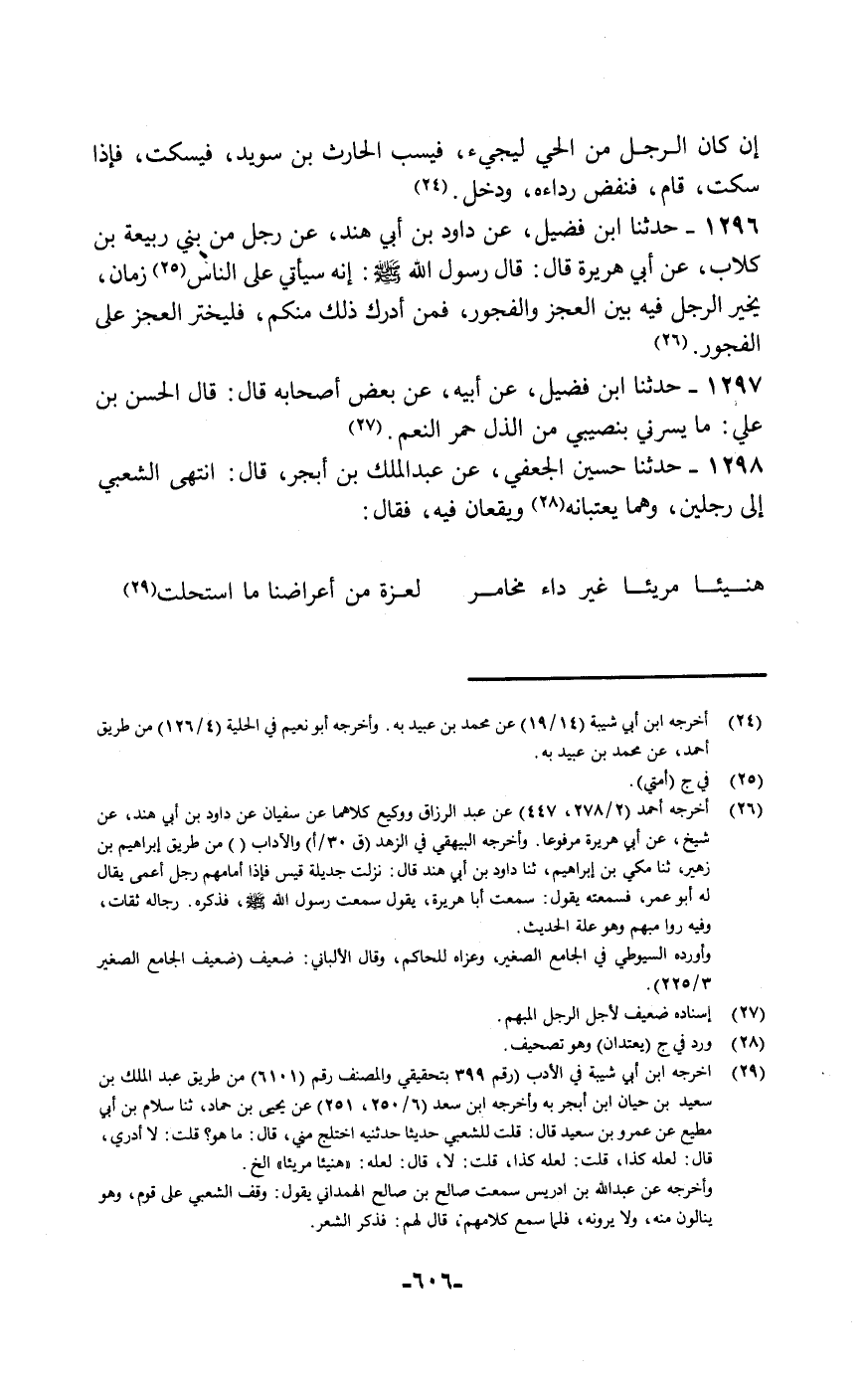 حَدَّثَنَا ابْنُ فُضَيْلٍ، عَنْ دَاوُدَ بْنِ أَبِي هِنْدَ، عَنْ رَجُلٍ مِنْ بَنِي رَبِيعَةَ بْنِ كِلَابٍ، عَنْ أَبِي هُرَيْرَةَ قَالَ: قَالَ رَسُولُ اللَّهِ صَلَّى اللهُ عَلَيْهِ وَسَلَّمَ: «إِنَّهُ §سَيَأْتِي عَلَى النَّاسِ زَمَانٌ يُخَيَّرُ الرَّجُلُ فِيهِ بَيْنَ الْعَجْزِ وَالْفُجُورِ فَمَنْ أَدْرَكَ ذَلِكَ مِنْكُمْ فَلْيَخْتَرِ الْعَجْزَ عَلَى الْفُجُورِ»