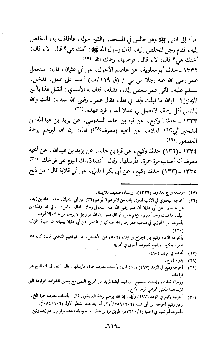 حَدَّثَنَا وَكِيعٌ، عَنْ قُرَّةَ بْنِ خَالِدٍ السَّدُوسِيِّ، عَنْ يَزِيدَ بْنِ عَبْدِ اللَّهِ بْنِ الشِّخِّيرِ أَبِي الْعَلَاءِ، عَنْ أَخِيهِ مُطَرِّفٍ قَالَ: «§إِنَّ اللَّهَ لَيَرْحَمُ بِرَحْمَةِ الْعُصْفُورِ»