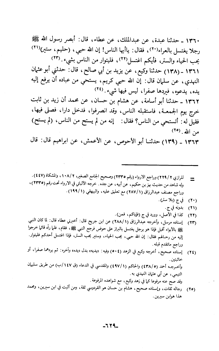 حَدَّثَنَا عَبْدَةُ، عَنْ عَبْدِ الْمَلِكِ، عَنْ عَطَاءٍ قَالَ: أَبْصَرَ رَسُولُ اللَّهِ صَلَّى اللهُ عَلَيْهِ وَسَلَّمَ رَجُلًا يَغْتَسِلُ بِالْعَرَاءِ , فَقَالَ: «يَا أَيُّهَا النَّاسُ , إِنَّ §اللَّهَ حَيِيُّ حَلِيمٌ سِتِّيرٌ يُحِبُّ الْحَيَاءَ وَالسِّتْرَ فَأَيُّكُمُ اغْتَسَلَ فَلْيَتَوَارَ مِنَ النَّاسِ بِشَيْءٍ»
