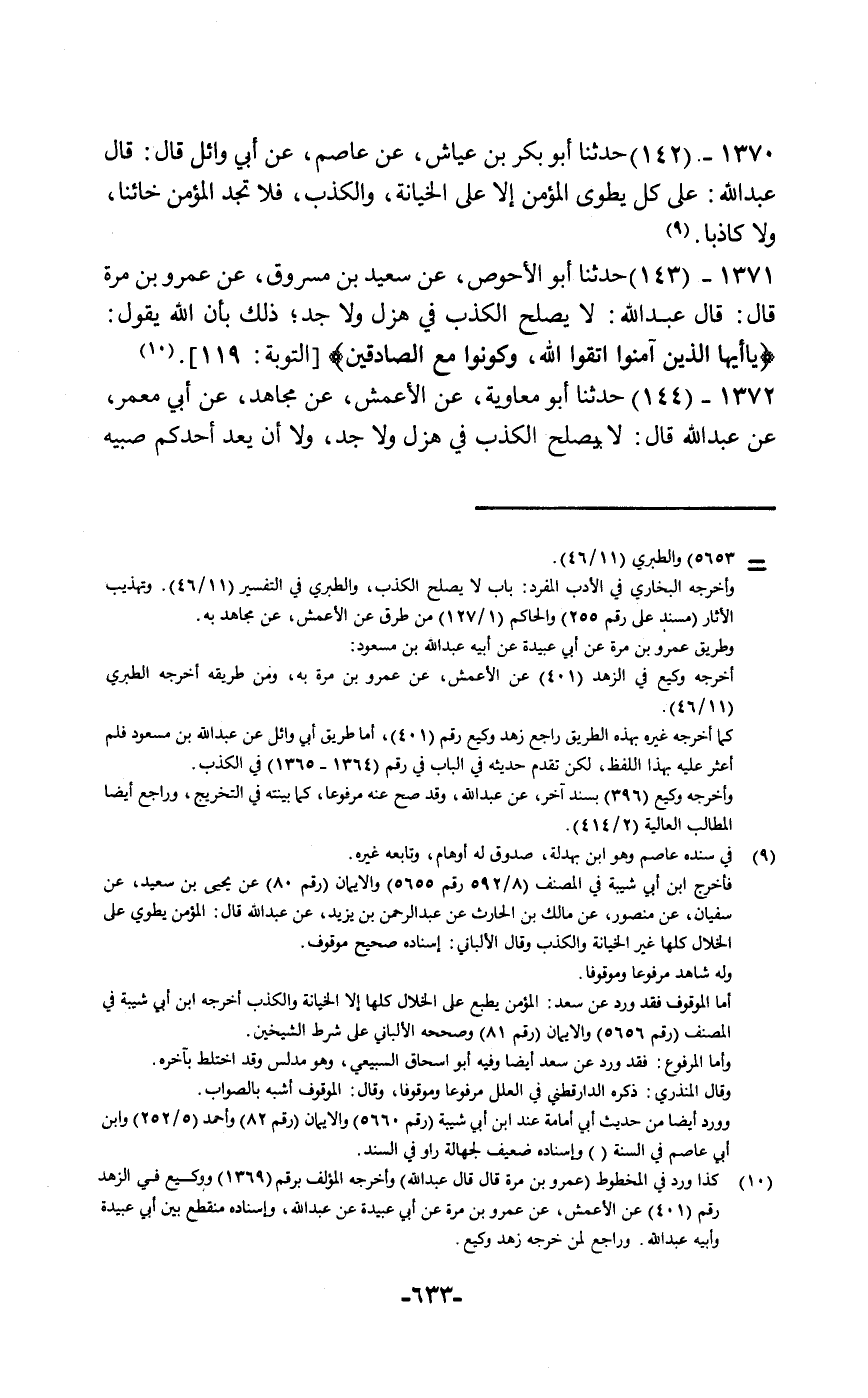 حَدَّثَنَا أَبُو بَكْرِ بْنُ عَيَّاشٍ، عَنْ عَاصِمٍ، عَنْ أَبِي وَائِلٍ قَالَ: قَالَ عَبْدُ اللَّهِ: «عَلَى كُلٍّ يُطْوَى الْمُؤْمِنُ §إِلَّا عَلَى الْخِيَانَةِ وَالْكَذِبِ فَلَا تَجِدُ الْمُؤْمِنَ خَائِنًا وَلَا كَاذِبًا»