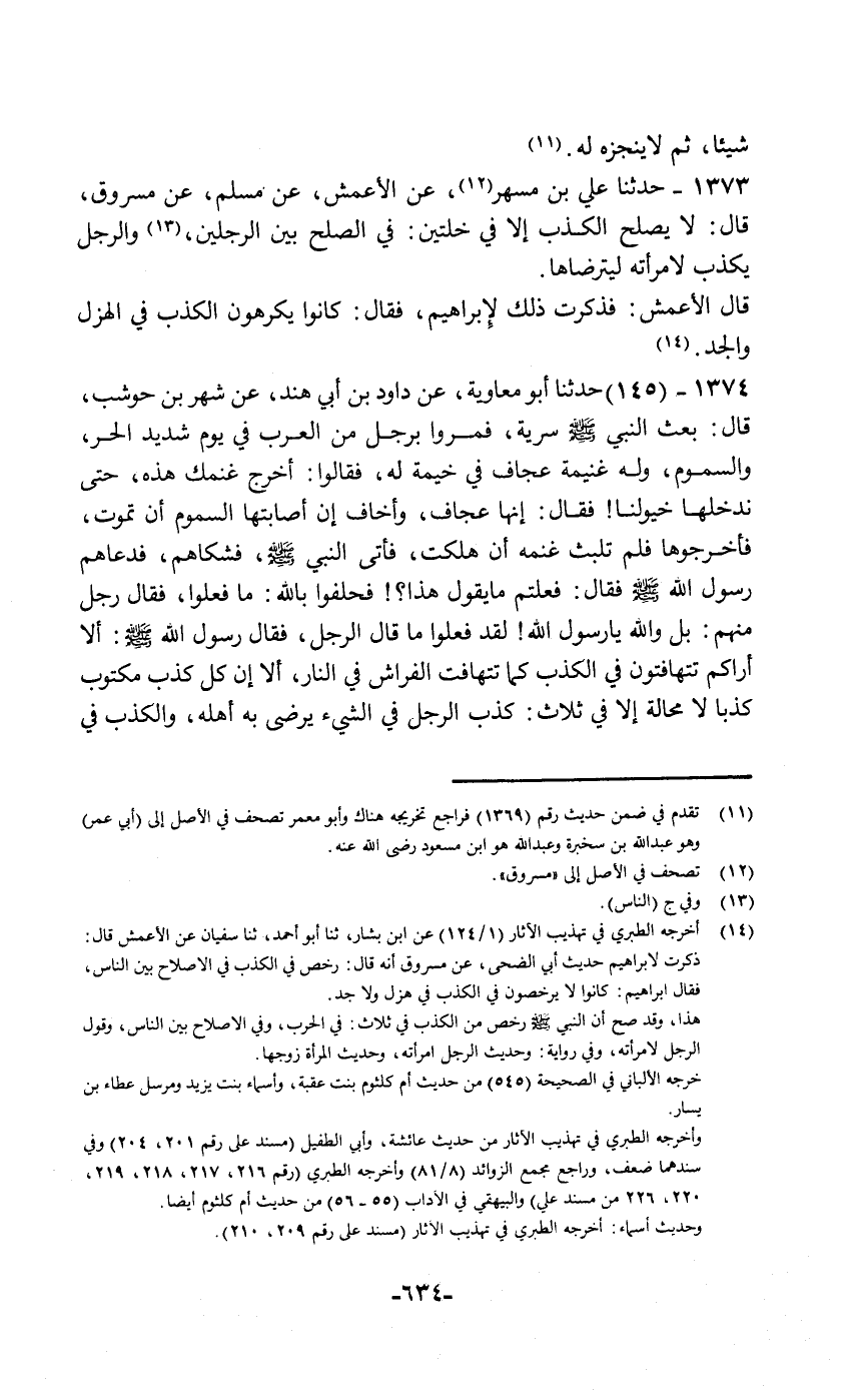حَدَّثَنَا أَبُو مُعَاوِيَةَ، عَنْ دَاوُدَ بْنِ أَبِي هِنْدَ، عَنْ شَهْرِ بْنِ حَوْشَبٍ قَالَ: بَعَثَ النَّبِيُّ صَلَّى اللهُ عَلَيْهِ وَسَلَّمَ سَرِيَّةً فَمَرُّوا بِرَجُلٍ مِنَ الْعَرَبِ فِي يَوْمٍ شَدِيدِ الْحَرِّ وَالسَّمُومِ وَلَهُ غُنَيْمَةٌ عِجَافٌ فِي خَيْمَةٍ لَهُ , فَقَالُوا: أَخْرِجْ غَنَمَكَ هَذِهِ حَتَّى نُدْخِلَهَا خُيُولَنَا، فَقَالَ: إِنَّهَا عِجَافٌ وَأَخَافُ إِنْ أَصَابَتْهَا السَّمُومُ أَنْ تَمُوتَ فَأَخْرَجُوهَا , فَلَمْ تَلْبَثْ غَنَمُهُ أَنْ هَلَكَتْ فَأَتَى النَّبِيَّ صَلَّى اللهُ عَلَيْهِ وَسَلَّمَ , فَشَكَاهُمْ , فَدَعَاهُمْ رَسُولُ اللَّهِ صَلَّى اللهُ عَلَيْهِ وَسَلَّمَ , فَقَالَ: «فَعَلْتُمْ مَا يَقُولُ هَذَا» ؟ فَحَلَفُوا بِاللَّهِ مَا فَعَلُوا، فَقَالَ رَجُلٌ مِنْهُمْ: بَلْ وَاللَّهِ يَا رَسُولَ اللَّهِ , لَقَدْ فَعَلُوا مَا قَالَ الرَّجُلُ، فَقَالَ رَسُولُ اللَّهِ صَلَّى اللهُ عَلَيْهِ وَسَلَّمَ: " أَلَا أَرَاكُمْ تَتَهَافَتُونَ فِي الْكَذِبِ كَمَا تَتَهَافَتُ الْفَرَاشُ فِي النَّارِ، أَلَا إِنَّ §كُلَّ كَذِبٍ مَكْتُوبٌ كَذِبًا لَا مَحَالَةَ إِلَّا فِي ثَلَاثٍ: كَذِبُ الرَّجُلِ فِي الشَّيْءِ يُرْضِي بِهِ أَهْلَهُ، وَالْكَذِبُ فِي -[635]- الشَّيْءِ يُصْلَحُ بِهِ بَيْنَ الرَّجُلَيْنِ، وَالْكَذِبُ فِي الْحَرْبِ فَإِنَّ الْحَرْبَ خَدْعَةٌ "