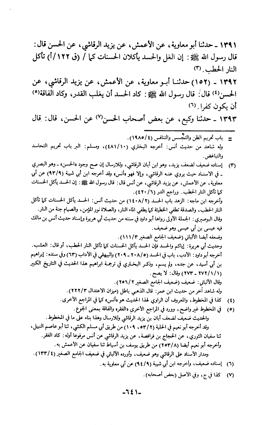 حَدَّثَنَا أَبُو مُعَاوِيَةَ، عَنِ الْأَعْمَشِ، عَنْ يَزِيدَ الرَّقَاشِيِّ، عَنِ الْحَسَنِ قَالَ: قَالَ رَسُولُ اللَّهِ صَلَّى اللهُ عَلَيْهِ وَسَلَّمَ: «إِنَّ §الْغِلَّ وَالْحَسَدَ يَأْكُلَانِ الْحَسَنَاتِ كَمَا تَأْكُلُ النَّارُ الْحَطَبَ»