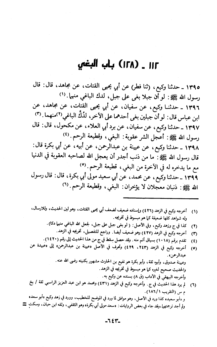 حَدَّثَنَا وَكِيعٌ، ثنا فِطْرٌ، عَنْ أَبِي يَحْيَى الْقَتَّاتِ، عَنْ مُجَاهِدٍ قَالَ: قَالَ رَسُولُ اللَّهِ صَلَّى اللهُ عَلَيْهِ وَسَلَّمَ: «§لَوْ أَنَّ جَبَلًا بَغَى عَلَى جَبَلٍ لَدُكَّ الْبَاغِي مِنْهُمَا»