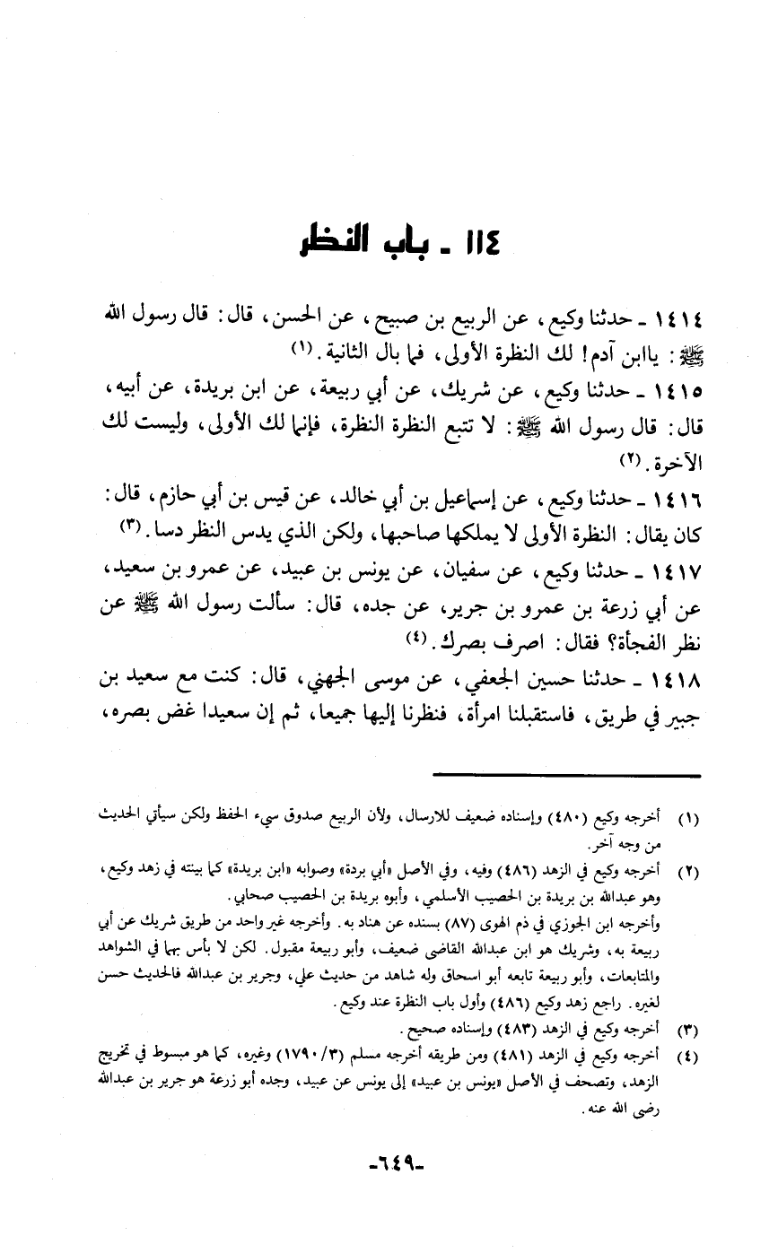 حَدَّثَنَا وَكِيعٌ، عَنِ الرَّبِيعِ بْنِ صُبَيْحٍ، عَنِ الْحَسَنِ قَالَ: قَالَ رَسُولُ اللَّهِ صَلَّى اللهُ عَلَيْهِ وَسَلَّمَ: «يَا ابْنَ آدَمَ §لَكَ النَّظْرَةُ الْأُولَى فَمَا بَالُ الثَّانِيَةِ»
