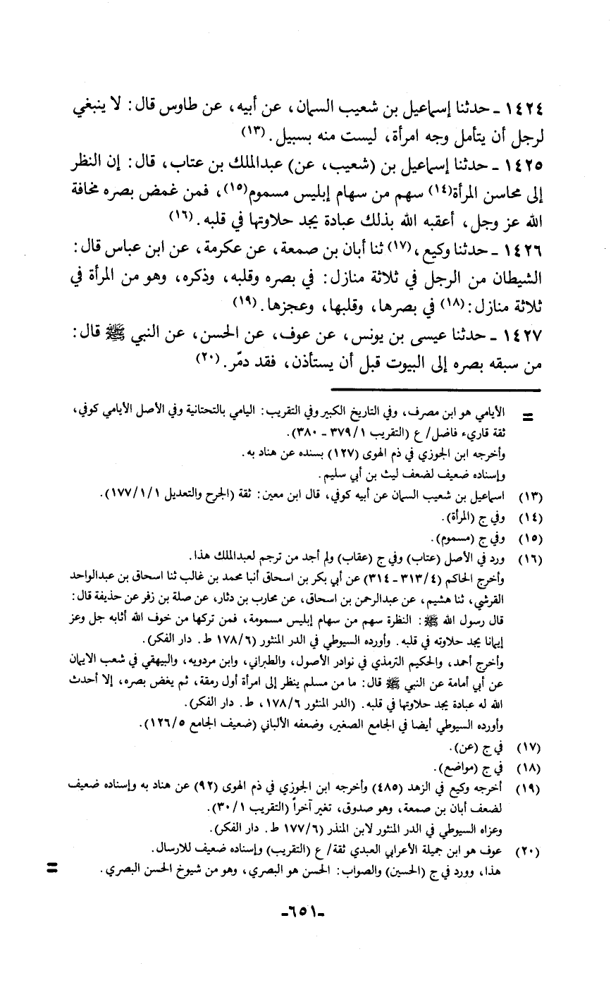 حَدَّثَنَا إِسْمَاعِيلُ بْنُ شُعَيْبٍ، عَنْ عَبْدِ الْمَلِكِ بْنِ عَتَّابٍ قَالَ: «إِنَّ §النَّظَرَ إِلَى مَحَاسِنِ الْمَرْأَةِ سَهْمٌ مِنْ سِهَامِ إِبْلِيسَ مَسْمُومٌ، فَمَنْ غَمَّضَ بَصَرَهُ مَخَافَةَ اللَّهِ عَزَّ وَجَلَّ أَعْقَبَهُ اللَّهُ بِذَلِكَ عِبَادَةً يَجِدُ حَلَاوَتَهَا فِي قَلْبِهِ»