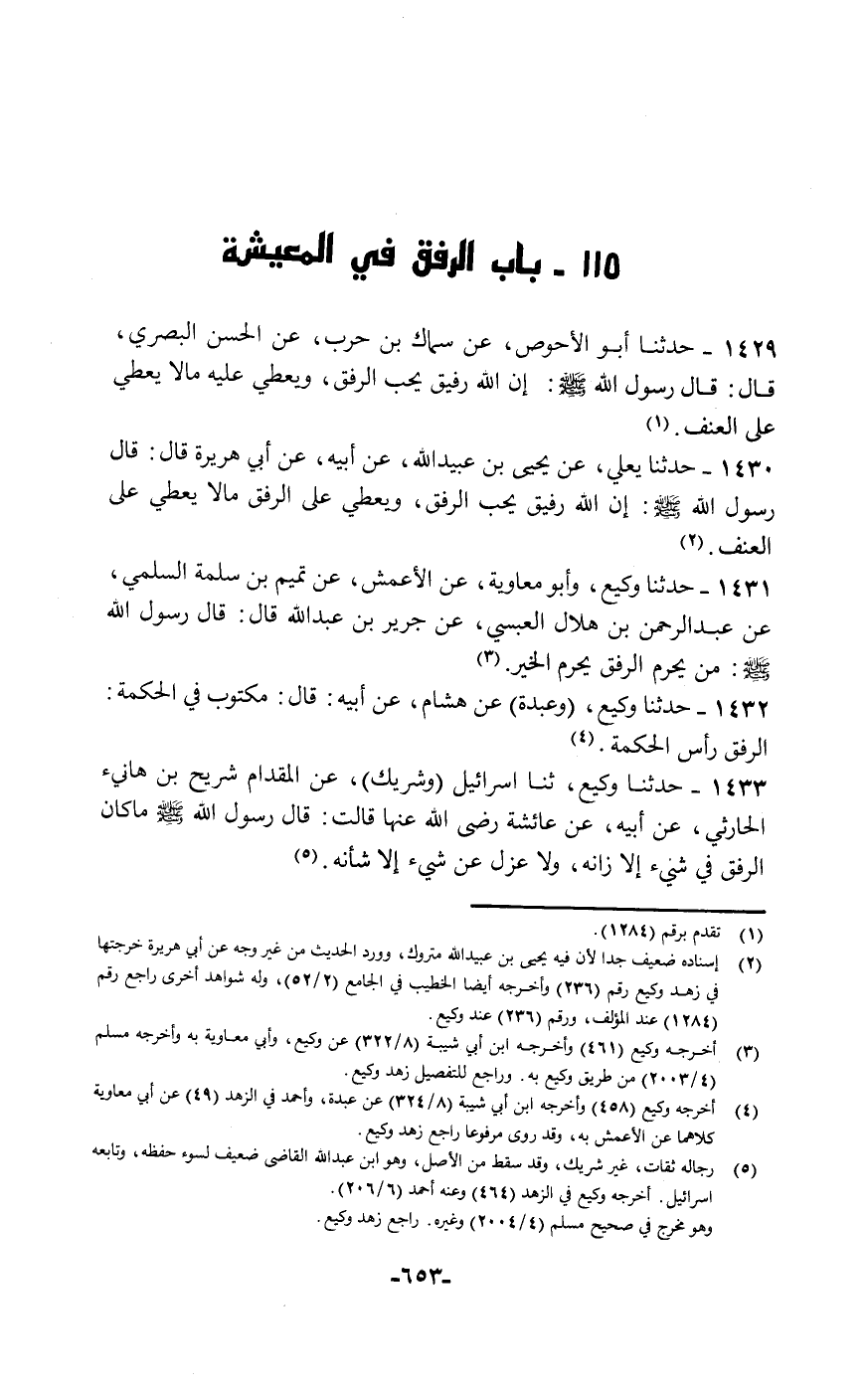 حَدَّثَنَا وَكِيعٌ، وَأَبُو مُعَاوِيَةَ عَنِ، الْأَعْمَشِ، عَنْ تَمِيمِ بْنِ سَلَمَةَ السُّلَمِيِّ، عَنْ عَبْدِ الرَّحْمَنِ بْنِ هِلَالٍ الْعَبْسِيِّ، عَنْ جَرِيرِ بْنِ عَبْدِ اللَّهِ قَالَ: قَالَ رَسُولُ اللَّهِ صَلَّى اللهُ عَلَيْهِ وَسَلَّمَ: «§مَنْ يُحْرَمِ الرِّفْقَ يُحْرَمِ الْخَيْرَ»