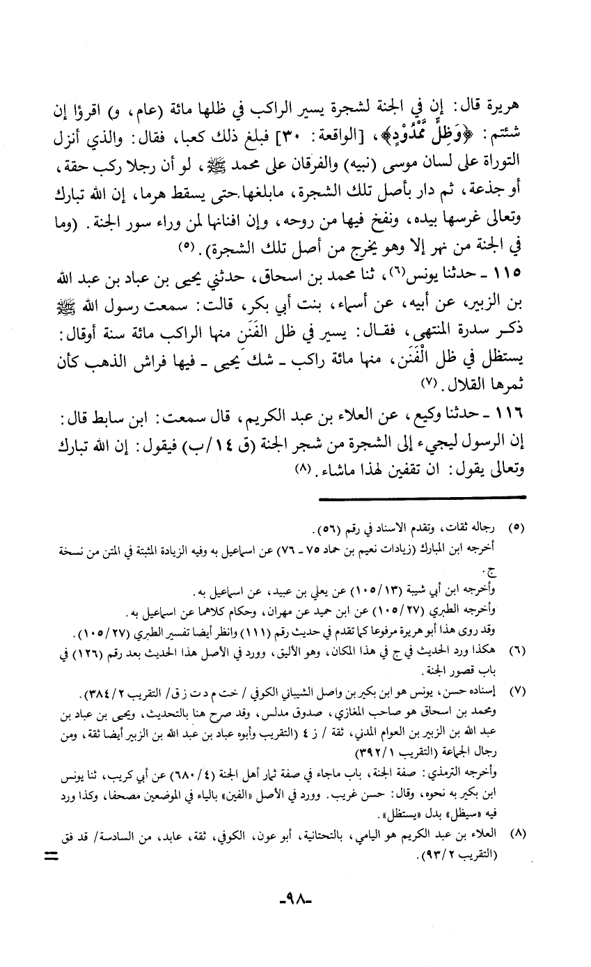 115 - حَدَّثَنَا يُونُسُ , ثنا مُحَمَّدُ بْنُ إِسْحَاقَ , حَدَّثَنِي يَحْيَى بْنُ عَبَّادِ بْنِ عَبْدِ اللَّهِ بْنِ الزُّبَيْرِ , عَنْ أَبِيهِ , عَنْ أَسْمَاءَ بِنْتِ أَبِي بَكْرٍ قَالَتْ: سَمِعْتُ رَسُولَ اللَّهِ صَلَّى اللهُ عَلَيْهِ وَسَلَّمَ §ذَكَرَ سِدْرَةَ الْمُنْتَهَى فَقَالَ: «يَسِيرُ فِي ظِلِّ الْفَنَنِ مِنْهَا الرَّاكِبُ مِائَةَ سَنَةٍ» , أَوْ قَالَ: «يَسْتَظِلُّ فِي ظِلِّ الْفَنَنِ مِنْهَا مِائَةُ رَاكِبٍ» , شَكَّ يَحْيَى فِيهَا فِرَاشُ الذَّهَبِ كَأَنَّ ثَمَرَهَا الْقِلَالُ