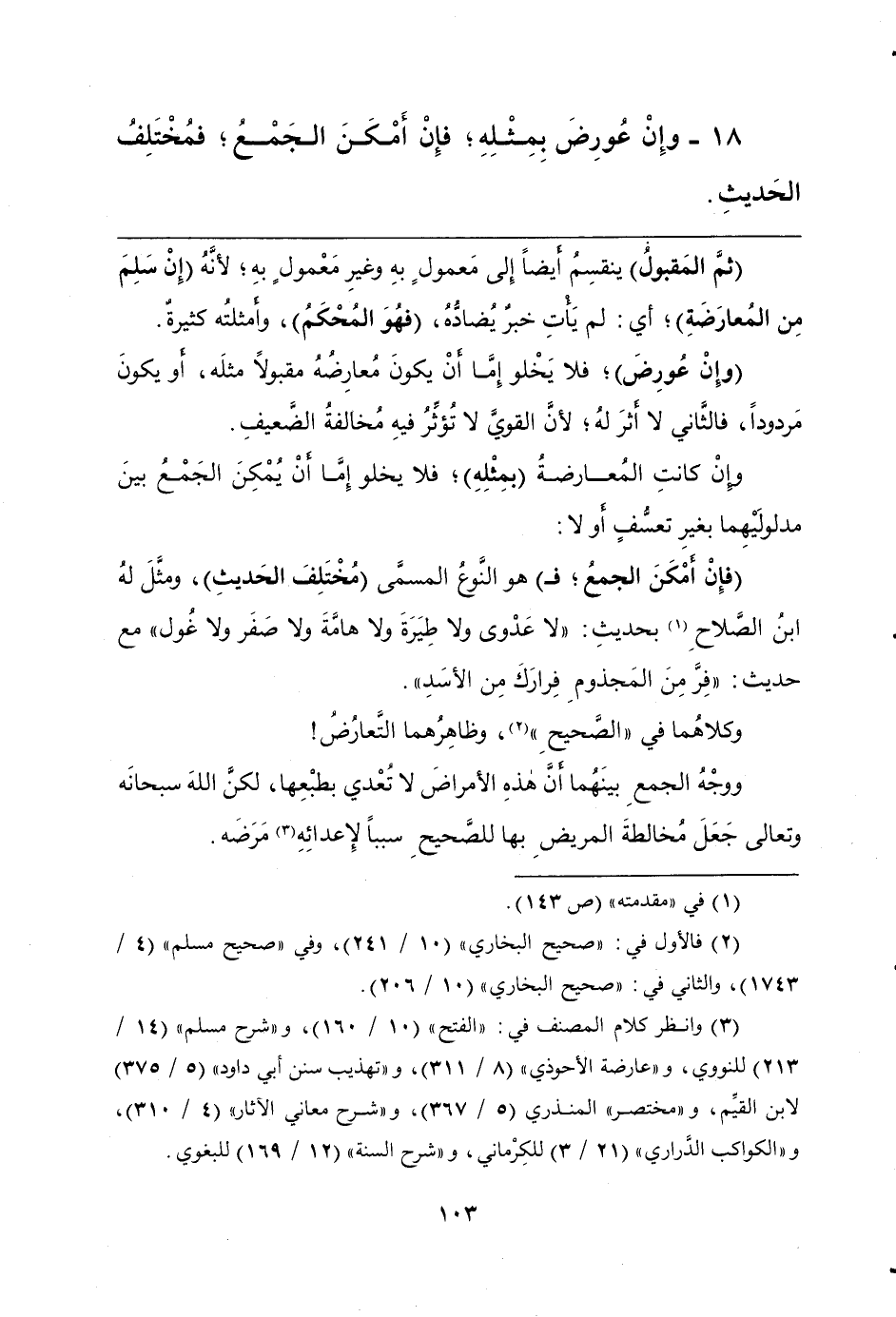 فإِنْ أَمْكَنَ الجَمْعُ؛ فهو النَّوعُ المُسمَّى "مُخْتَلِفَ الحَديثِ"، ومثَّلَ لهُ ابنُ الصَّلاحِ بحديثِ: "لا عَدْوى ولا طِيَرَةَ، ولا هامَّةَ، ولا صَفَر، ولا غُول" مع حديث: "فِرَّ مِنَ المَجذومِ فِرارَكَ مِن الأسَدِ".