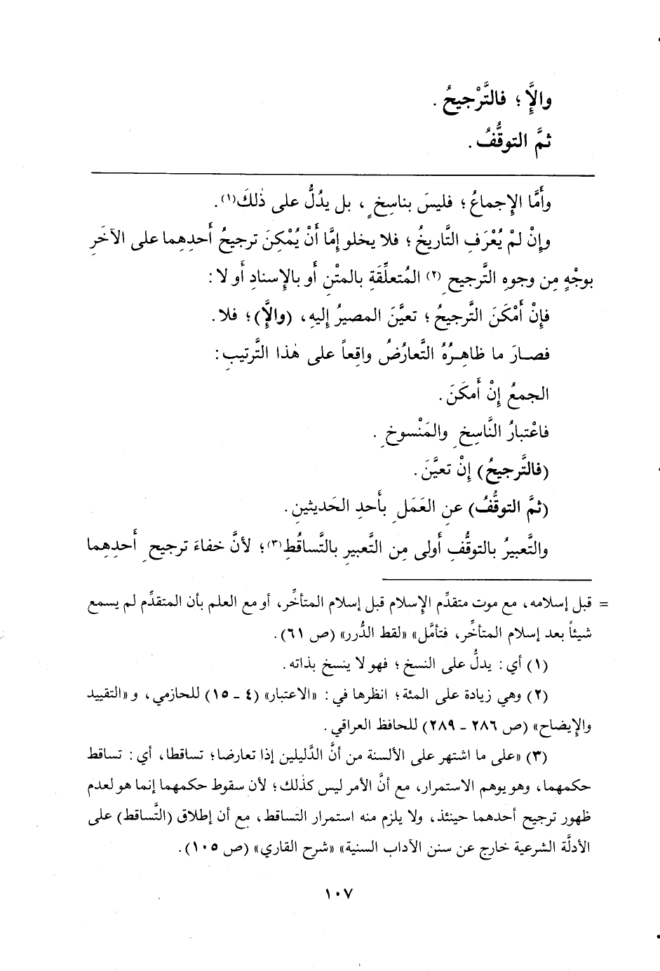 وإِنْ لمْ يُعْرَفِ التَّاريخُ؛ فلا يخلو إِمَّا أَنْ يُمْكِنَ ترجيحُ أَحدِهِما على الآخَرِ بوجْهٍ مِن وجوهِ التَّرجيحِ المُتعلِّقَةِ بالمتْنِ أَو بالإِسنادِ أَوْ لاَ: