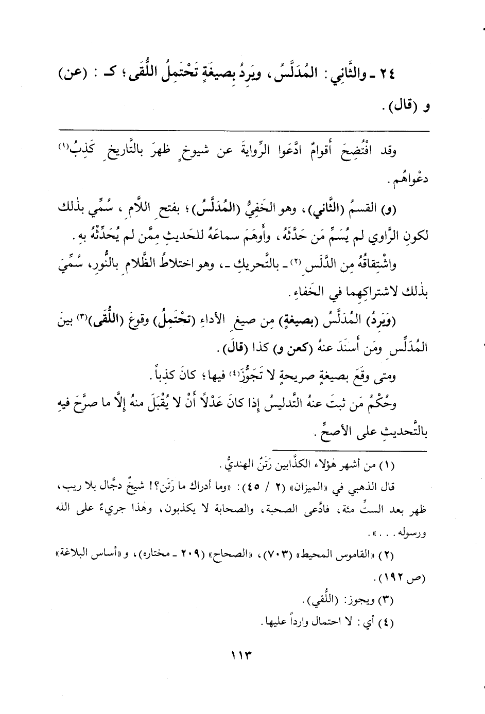 24 - والثَّانِي: المُدَلَّسُ، ويَرِدُ بِصيغَةٍ تَحْتَمِلُ اللُّقِيَّ كـ (عَن) و(قَاَلَ)