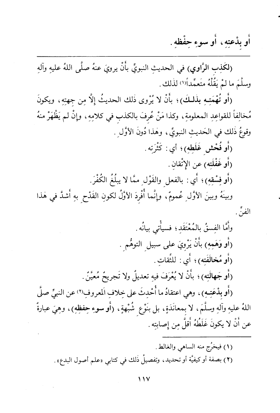 (أَو بِدْعتِهِ)، وهي اعتقادُ ما أُحْدِثَ على خِلافِ المَعروفِ عن النبيِّ صلَّى اللهُ عليهِ وآلهِ وسلَّمَ، لا بِمعانَدَةٍ، بل بنَوْعِ شبهةٍ، (أَو سوءِ حِفْظهِ)، وهِيَ عبارةٌ عن أَنْ لا يكونَ غَلَطُهُ أَقلَّ مِن إِصابتِه.