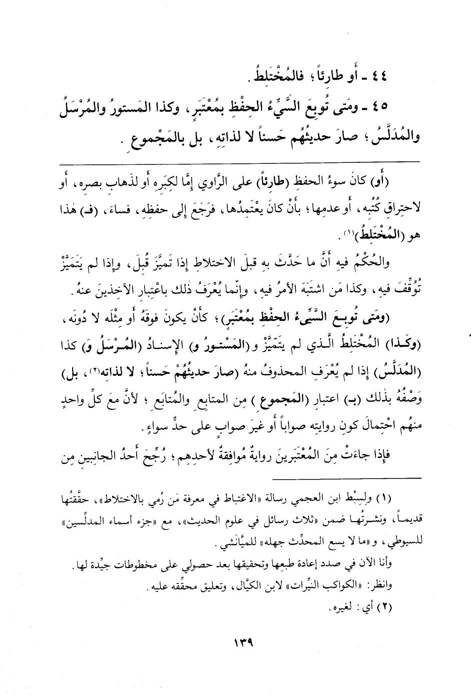 45 - وَمَتَى تُوبِعَ سَيْئُّ الْحِفْظِ بِمُعْتَبَرٍ، وَكَذَا الْمَسْتُورُ وَالْمُرْسَلُ، وَالْمُدلَّسُ؛ صَارَ حَدِيثُهُمْ حَسَنًا لَا لِذَاتِهِ، بَلْ بِالْمَجْمُوعِ.
