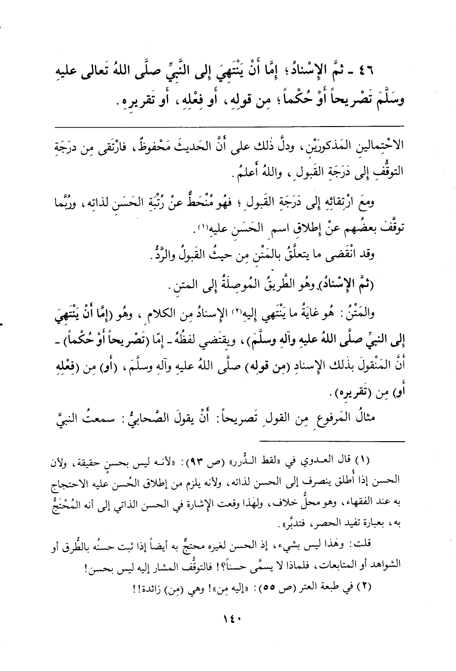46 - ثُمَّ الْإِسْنَادُ؛ إِمَّا أَنْ يَنْتَهِيَ إِلَى النَّبيِّ صَلَّى اللَّهُ تَعَالَى عَلَيْهِ وَسِلَّمَ تَصْرِيحًا أَوْ حُكْمًا؛ مِنْ قَوْلِهِ، أَوْ فِعْلِهِ، أَوْ تَقْرِيرِهِ.