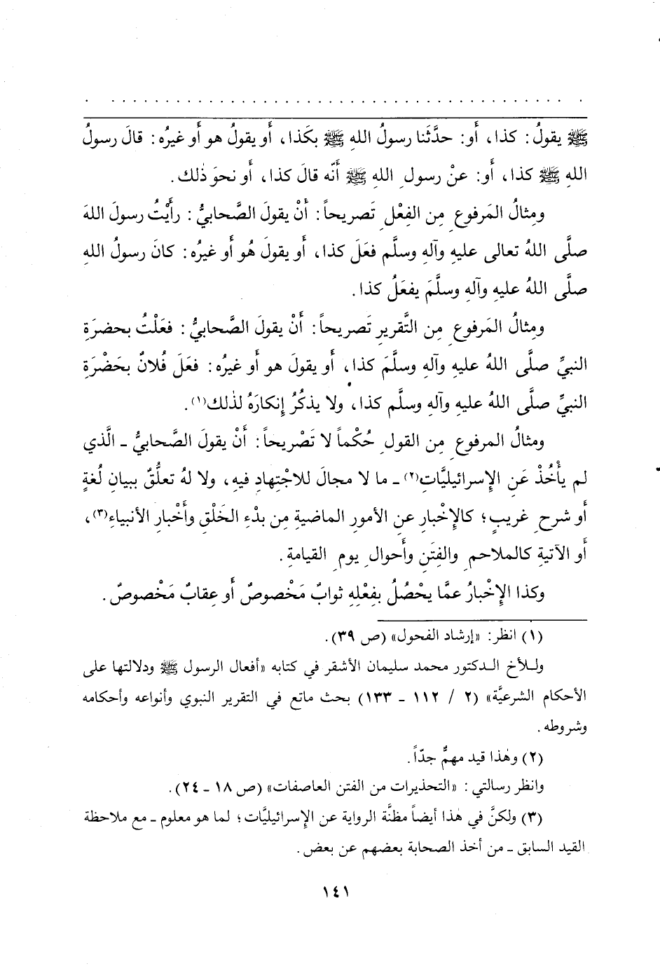 ومِثالُ المَرفوعِ مِن الفِعْلِ تَصريحاً: أَن يقولَ الصَّحابيُّ: رأَيْتُ رسولَ اللهِ صلَّى اللهُ عليهِ وآلهِ وسلَّمَ فعَلَ كذا، أَو يقولَ هُو أَو غيرُه: كانَ رسولُ اللهِ صلَّى اللهُ عليهِ وآلهِ وسلَّمَ يفعَلُّ كذا.