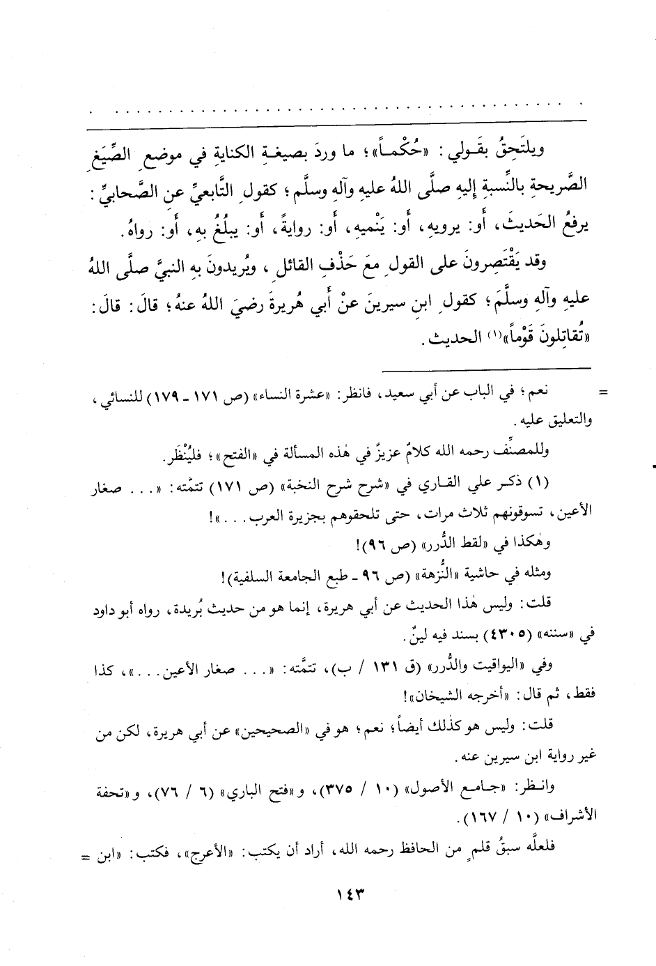 ويلتَحِقُ بقَولي: حُكْماً؛ ما وردَ بصيغةِ الكنايةِ في موضعِ الصِّيَغِ الصَّريحةِ بالنِّسبةِ إِليه صلَّى اللهُ عليهِ وآلهِ وسلَّمَ؛ كقولِ التَّابعيِّ عنِ الصَّحابيِّ: يرفعُ الحَديثَ، أو: يرويهِ، أو: يَنْميهِ، أَو: روايةً، أَو: يبلُغُ بهِ، أَو: رواهُ.