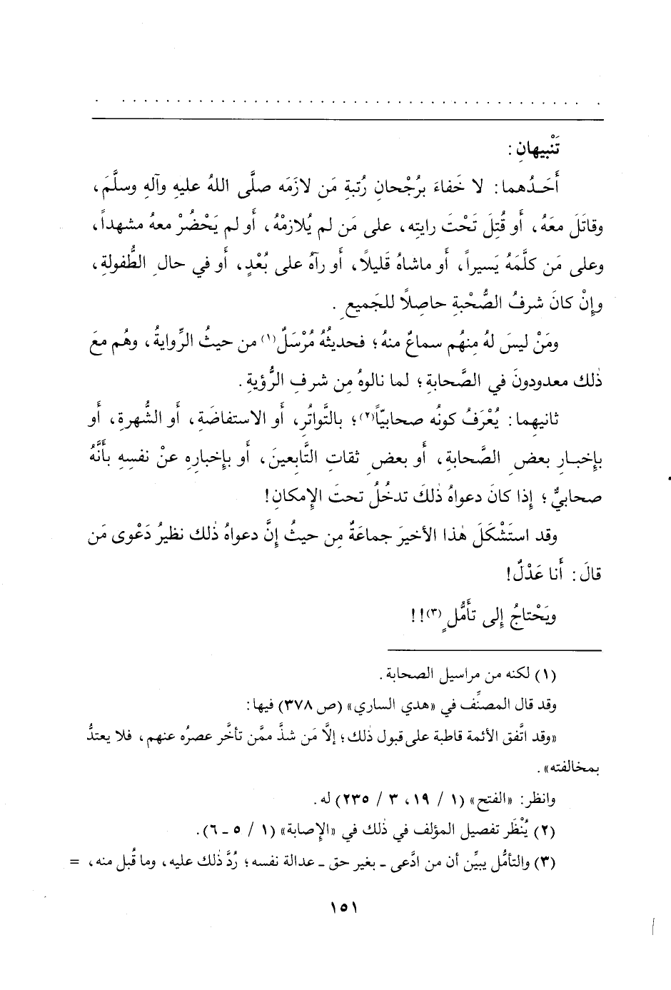 أَحَدُهما: لا خَفاءَ برُجْحانِ رُتبةِ مَن لازَمَه صلَّى اللهُ عليهِ وآلهِ وسلَّمَ، وقاتَلَ معَهُ، أَو قُتِلَ تَحْتَ رايتِه، على مَن لم يُلازمْهُ، أَو لم يَحْضُرْ معهُ مشهداً، وعلى مَن كلَّمَهُ يَسيراً، أَو ماشاهُ قَليلاً، أَو رآهُ على بُعْدٍ، أَو في حالِ الطُّفولةِ، وإِن كانَ شرفُ الصُّحْبةِ حاصِلاً للجَميعِ.