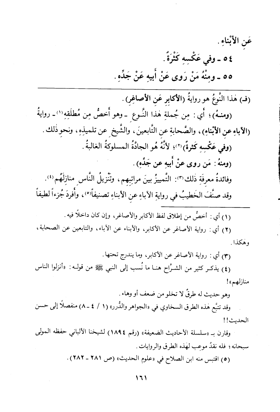 (ومِنهُ)؛ أَي: مِن جُملةِ هذا النَّوعِ - وهو أَخصُّ مِن مُطلَقِهِ - روايةُ (الآباءُ عَنِ الأبْناءِ)، والصَّحابةِ عنِ التَّابعينَ، والشَّيخِ عن تلميذِهِ، ونحوِ ذلك.