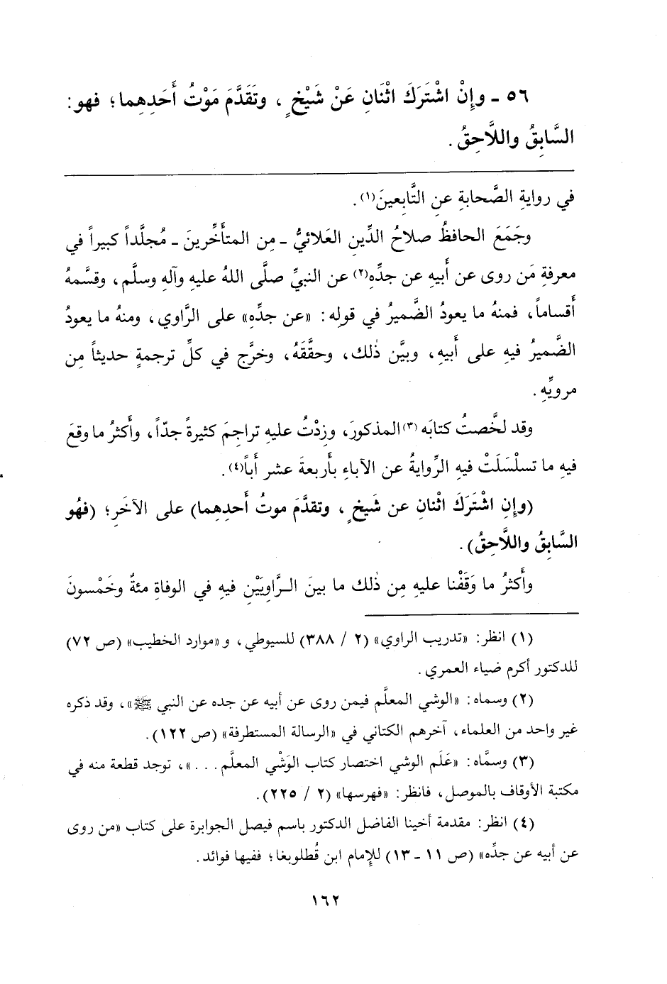 وجَمَعَ الحافظُ صلاحُ الدِّينِ العَلائيُّ - مِن المتأَخِّرينَ - مُجلَّداً كبيراً في معرفةِ مَن روى عن أَبيهِ عن جدِّهِ عن النبيِّ صلَّى اللهُ عليهِ وآلهِ وسلَّمَ، وقسَّمهُ أَقساماً، فمنهُ ما يعودُ الضَّميرُ في قولِه: "عن جدِّهِ" على الرَّاوي، ومنهُ ما يعودُ الضَّميرُ فيهِ على أَبيهِ، وبيَّن ذلك، وحقَّقَهُ، وخرَّج في كلِّ ترجمةٍ حديثاً مِن مرويِّهِ.