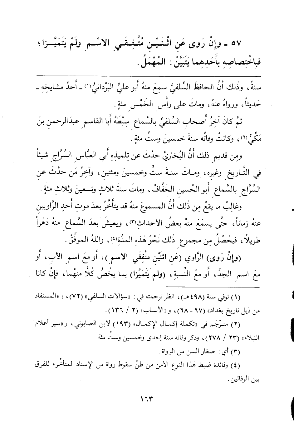 57 - وَإِنْ رَوَى عَنْ اثْنَيْنِ مُتَّفِقِي الْاسْمِ وَلَمْ يَتَمَيْزَا؛ فَبِاخْتِصَاصِهِ بِأَحَدِهِمَا يَتَبَيْنُ: الْمُهْمَلُ.