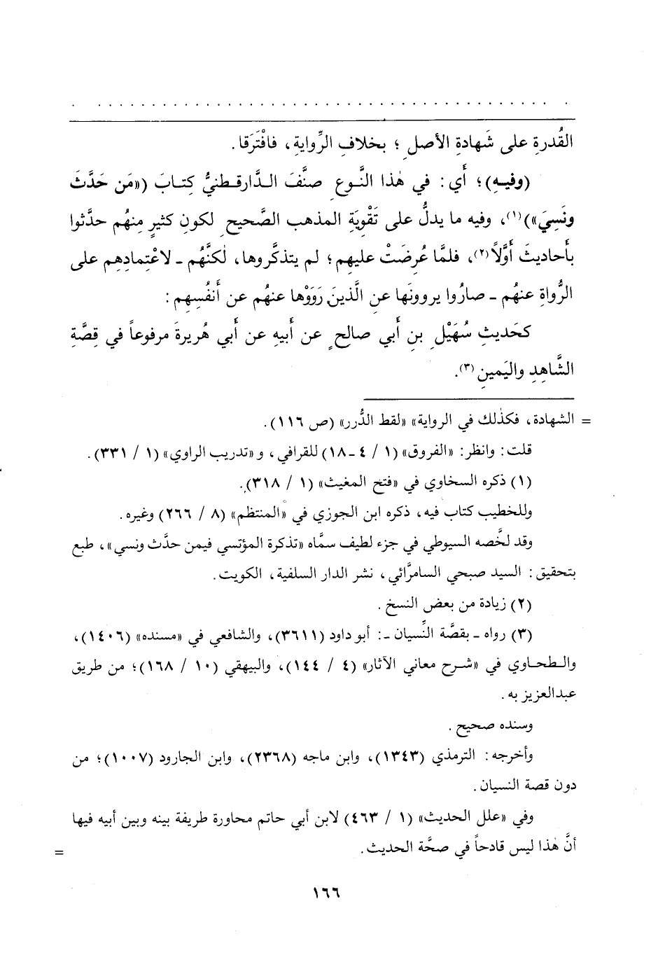 (وفيهِ)؛ أَي: في هذا النَّوعِ صنَّفَ الدَّارقطنيُّ كِتابَ (مَنْ حَدَّثَ ونَسِيَ)، وفيه ما يدلُّ على تَقْوِيَةِ المذهب الصَّحيحِ لكونِ كثيرٍ مِنهُم حدَّثوا بأَحاديثَ أَوَّلاً، فلمَّا عُرِضَتْ عليهِم، لم يتذكَّروها، لكنَّهُم - لاعْتِمادِهم على الرُّواةِ عنهُم - صارُوا يروونَها عنِ الَّذينَ رَوَوْها عنهُم عن أَنْفُسِهِم.